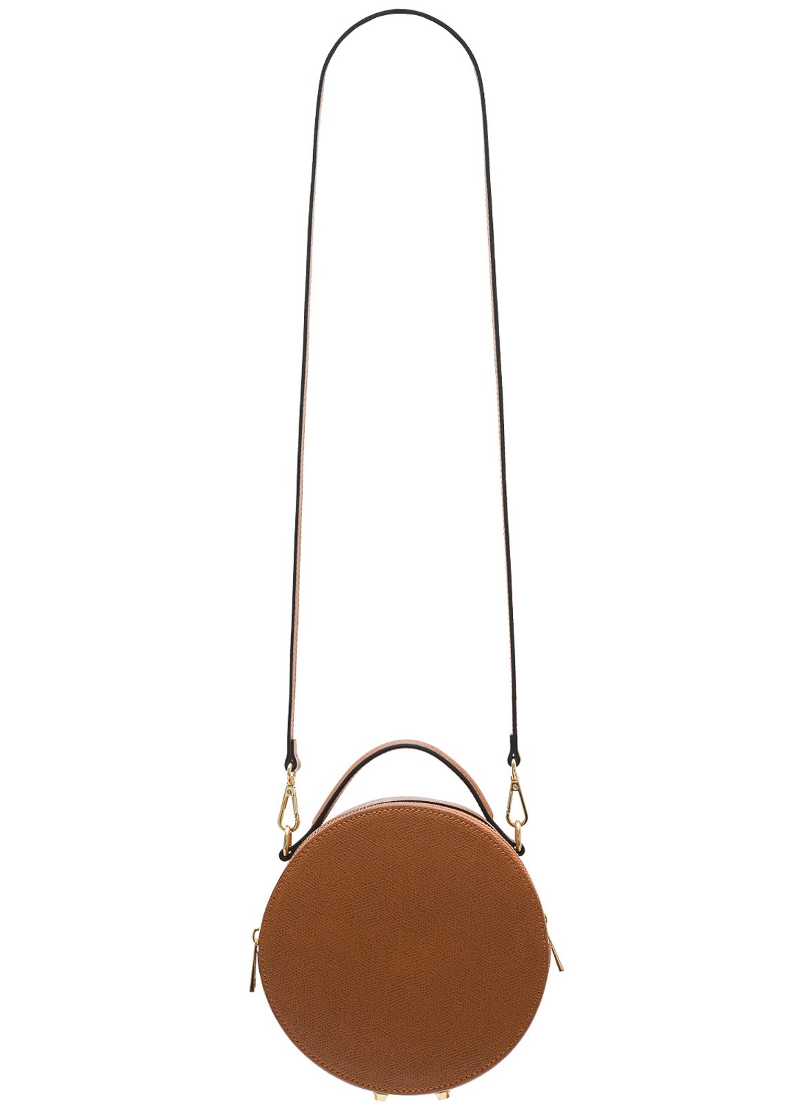 Dámská crossbody kabelka kulatá v hnědé barvě. Kabelka je pevná a drží tvar. Zajímavá je svým kulatým tvarem, velmi netypická. Hodí se k nošení přes rameno, díky dlouhému tracku. Vzít jí můžete i do ruky za malé poutko. Zapínání je řešeno na dva zipy, které jsou na obou stranách kabelky. Hodí se k šatům do práce, do města i na párty.
