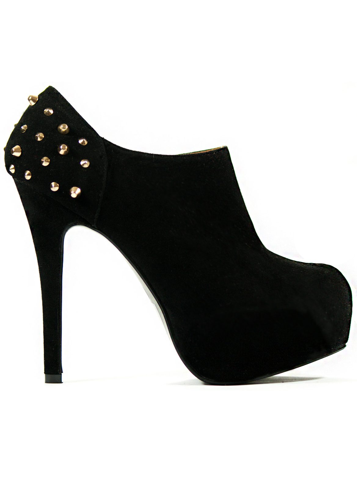 Dámské kotníkové boty se zlatými ostny, na platformě v černé barvě v provedení imitace semiše. Uzavřená špička a stabilní platforma. Zapínání po straně na zip.
