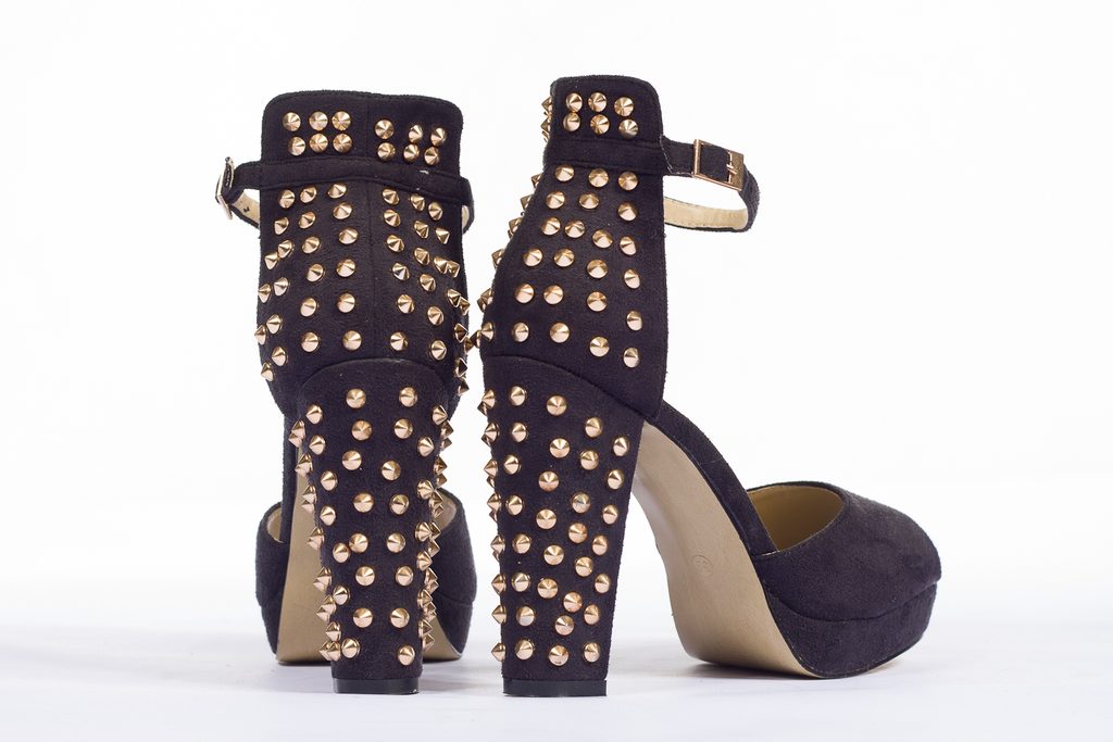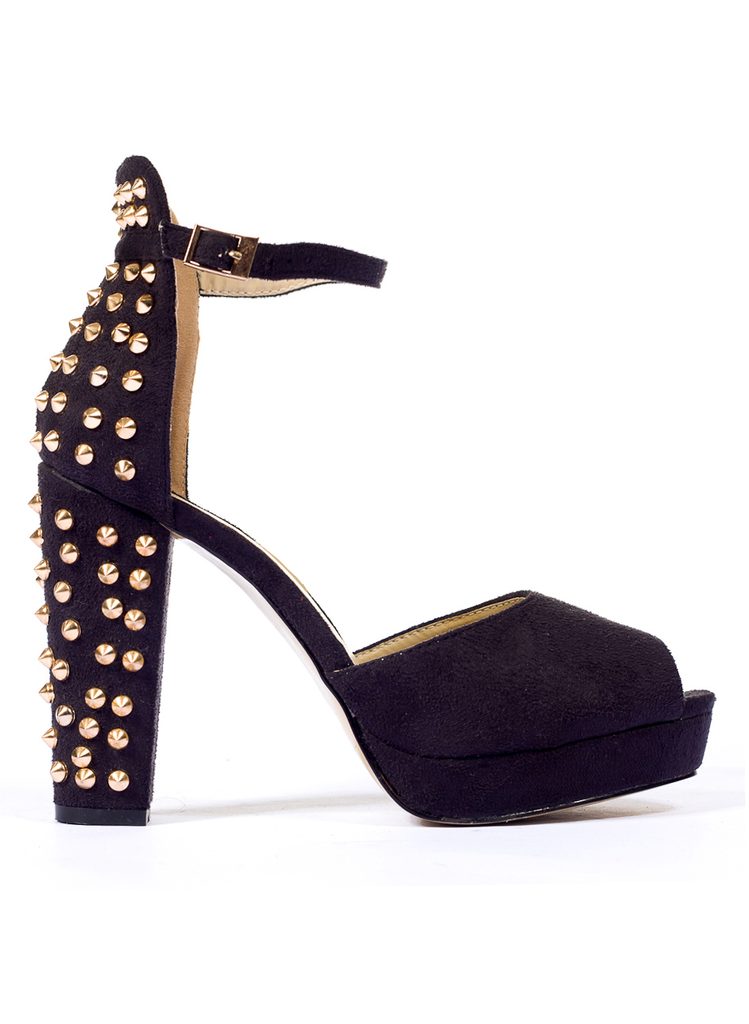 Dámské lodičky na platformě černé, zadní část boty zdobena zlatými ostny. Lodičky mají otevřenou špičku a zapínání na pásek.