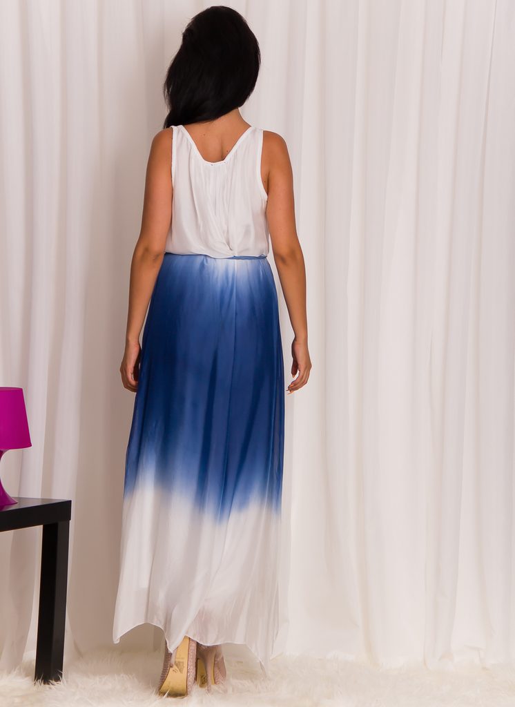 Dámské letní šaty ve modré barvě. Šaty jsou dlouhé, jsou bez rukávů, uvazují se. Všita je podšívka v délce nad kolena, látka je částečně průhledná. Vrchní část je z pravého hedvábí a šaty jsou díky tomu velice vzdušné a lehké. Velice exkluzivní šaty! Vhodné na párty, pro volný čas.