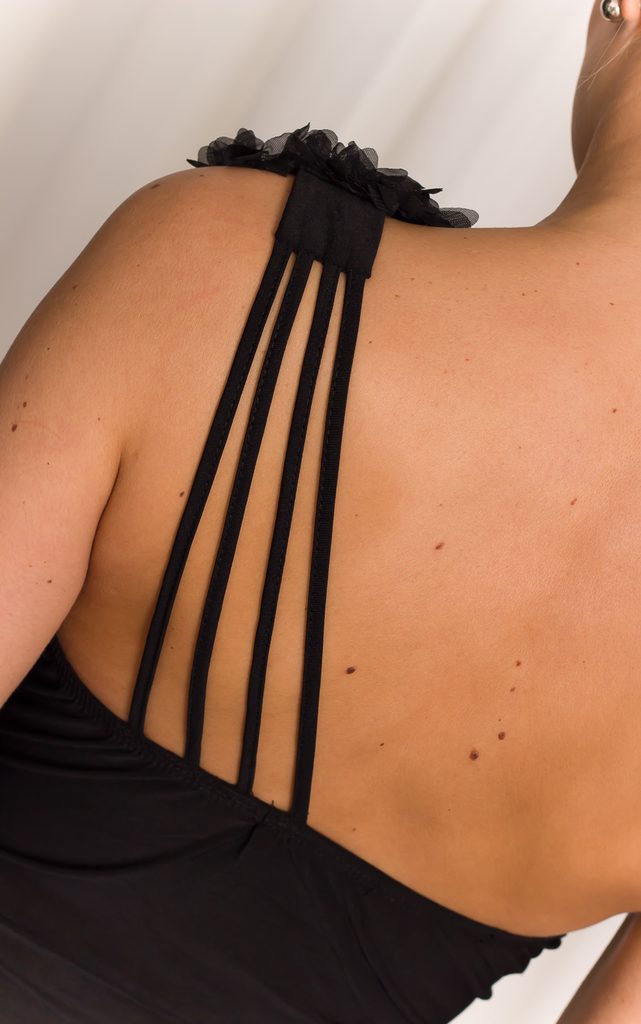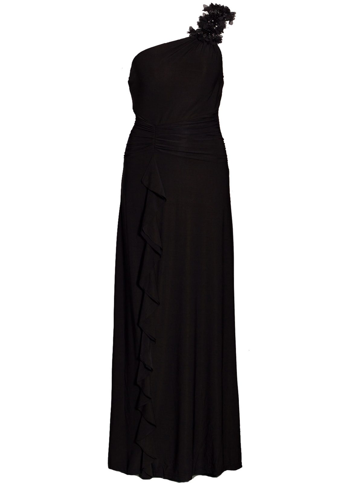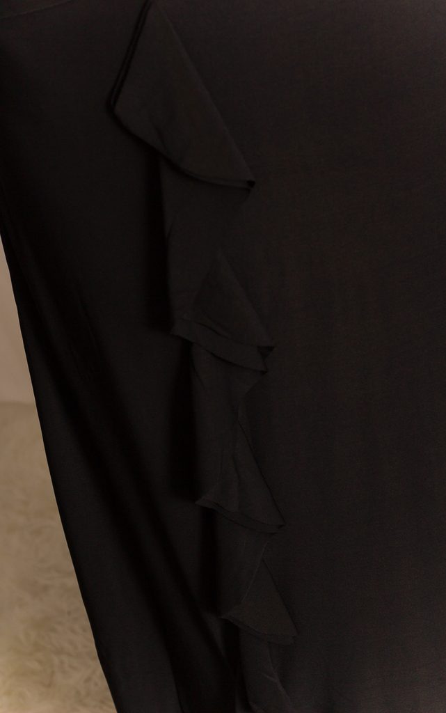 Dlouhé společenské elegantní šaty v černé barvě. Šaty jsou na jedno rameno, kde jsou zdobeny černými květy z kamínků. Zadní část ramínka je rozděla na tři tenké části. Na prsou mají vycpávky. V pase mají šaty lehce nabíranou látku. Od pasu dolů je černý volánek, který šaty zdobí. Šaty jsou uplého střihu, skvěle sedí. Vhodné na plesy či společenské události.
