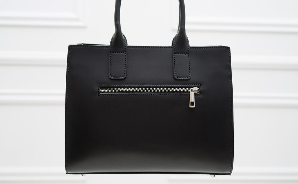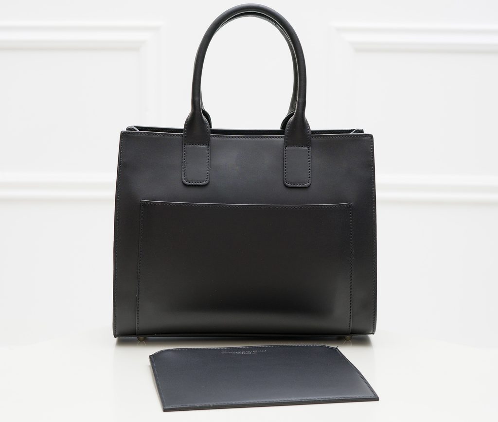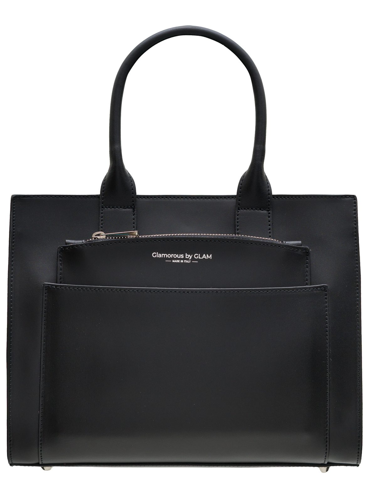 Dámská jednoduchá kabelka do ruky v černé barvě. Kabelka je pevná a drží tvar. Kabelka má kratší poutka pro nošení v ruce. Kabelka je zajímavá přední kapsičkou, která lze vyndat. Na kapsičce je stříbrné logo Glamorous by Glam. Zapínání je řešeno na zip. Kabelka vypadá velmi zajímavě a je praktická. Nejvíce se hodí k elegantnímu outfitu, do práce i do města. Součástí kabelky je přídavný track.