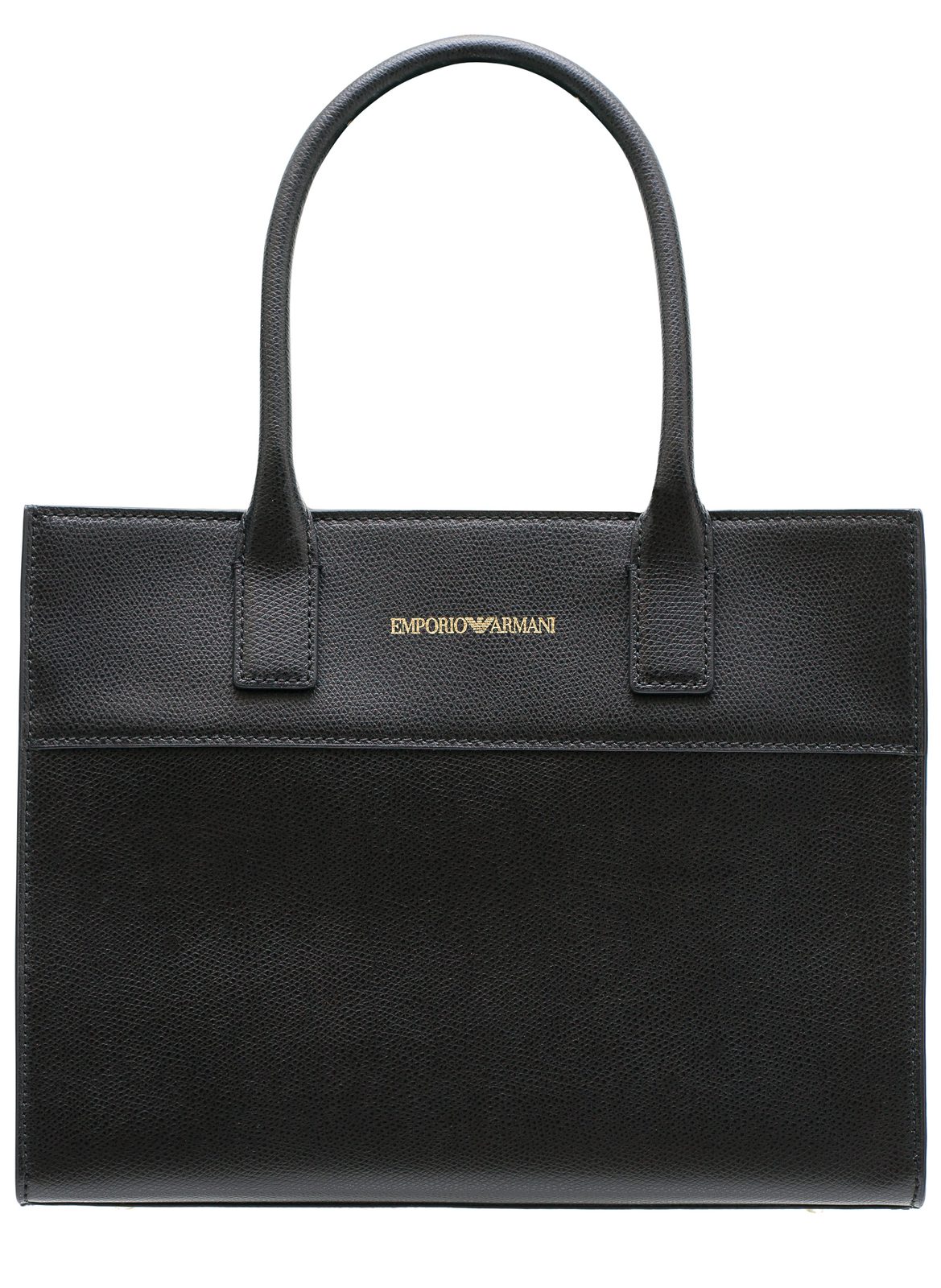 Dámská kožená kabelka do ruky v černé barvě. Kabelka je značky EMPORIO ARMANI. Kabelka je pevná a drží tvar. Zapínání je řešeno na zip. Přední strana kabelky je doplněna zlatým logem značky. Elegantní kabelka se hodí k nošení do práce i do města.