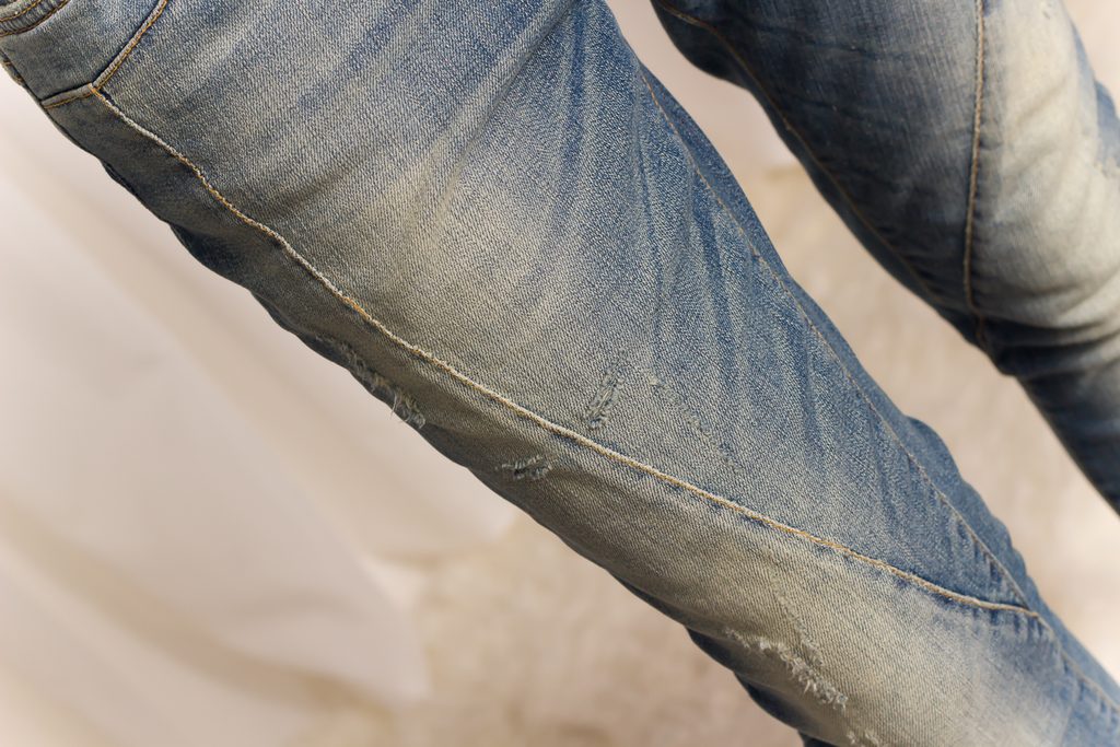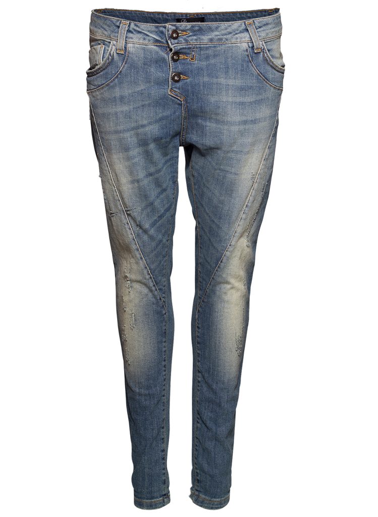 Dámské světlé džíny s nížším sedem. Džíny jsou kratšího, v dolní části užšího střihu a jsou lehce potrhané. Džíny mají na přední a zadní straně dvě kapsy. Zapínání je řešeno na knoflíky. Vhodné ke sportovnímu out-fitu, do města i pro volný čas.