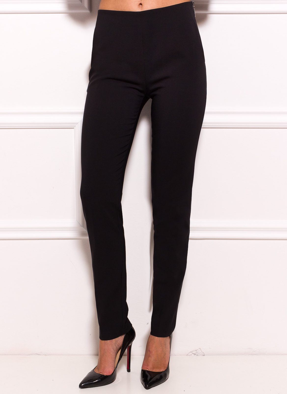 Dámské společenské kalhoty na zip v černé barvě. Kalhoty mají vyšší pas. Zapínání je řešeno na zip, který je na boku. Po obou stranách boků jsou kapsy. Na zadní straně jsou kapsy falešné. Kalhoty perfektně sedí na těle a mají příjemný materiál. Skvěle se kalhoty doladí se sakem ze stejného materiálu....viz dolaď si outfit :-) Tím docílíte, že máte krásně vypadající kostýmek :-) Ke kalhotům můžere vzít halenku či top a budete vypadat skvěle :-) Vhodné k nošení do práce či na společenské události.