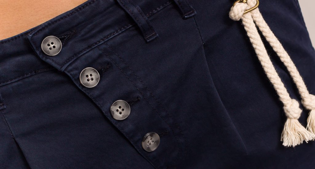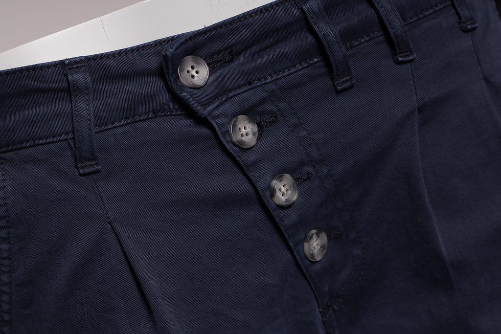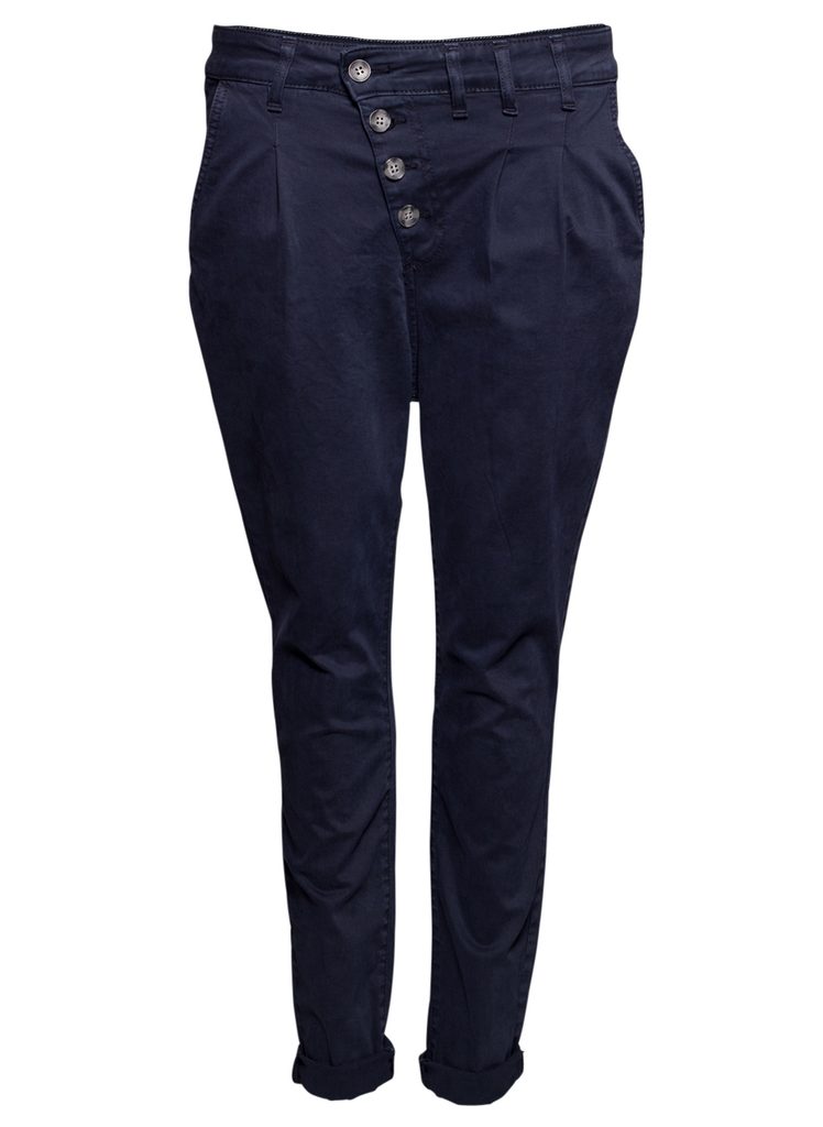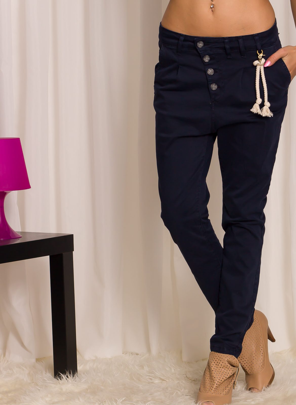 Dámské kalhoty s nízkým sedem v modré barvě. Kalhoty jsou z příjemného materiálu, skvěle sedí. V přední části na bocích jsou kapsy. Zapínání kalhot je na více knoflíků, které jsou asymetricky ušity. V zadní části jsou falešné kapsy. Vhodné ke sportovnímu out-fitu, do města i pro volný čas.