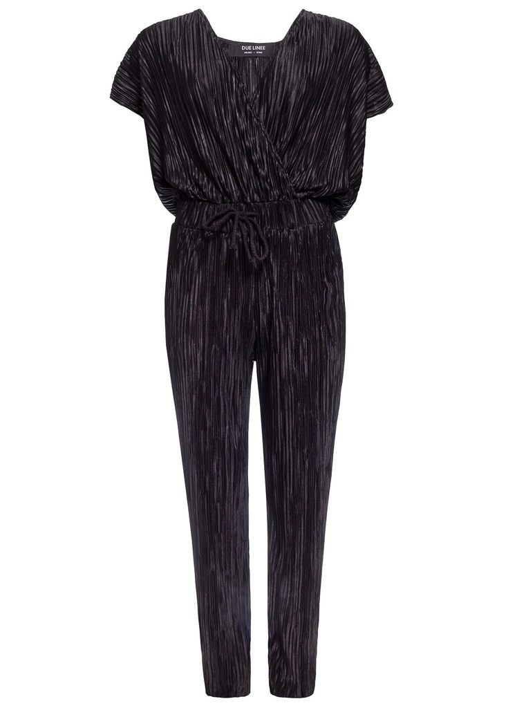 Dámský elegantní lesklý overal v černé barvě. Overal má lehce stažené krátké rukávy a hluboký výstřih. V pase je overal na elastickou gumu a provázek na stažení. Po stranách má overal kapsičky. Overal je volnějšího střihu a je elastický. Má zajímavou strukturu - ,,mačkavý" vzhled. Materiál je příjemný na dotek. Overal skvěle sedí na těle. Hodí se k nošení jak do města, tak i na párty.