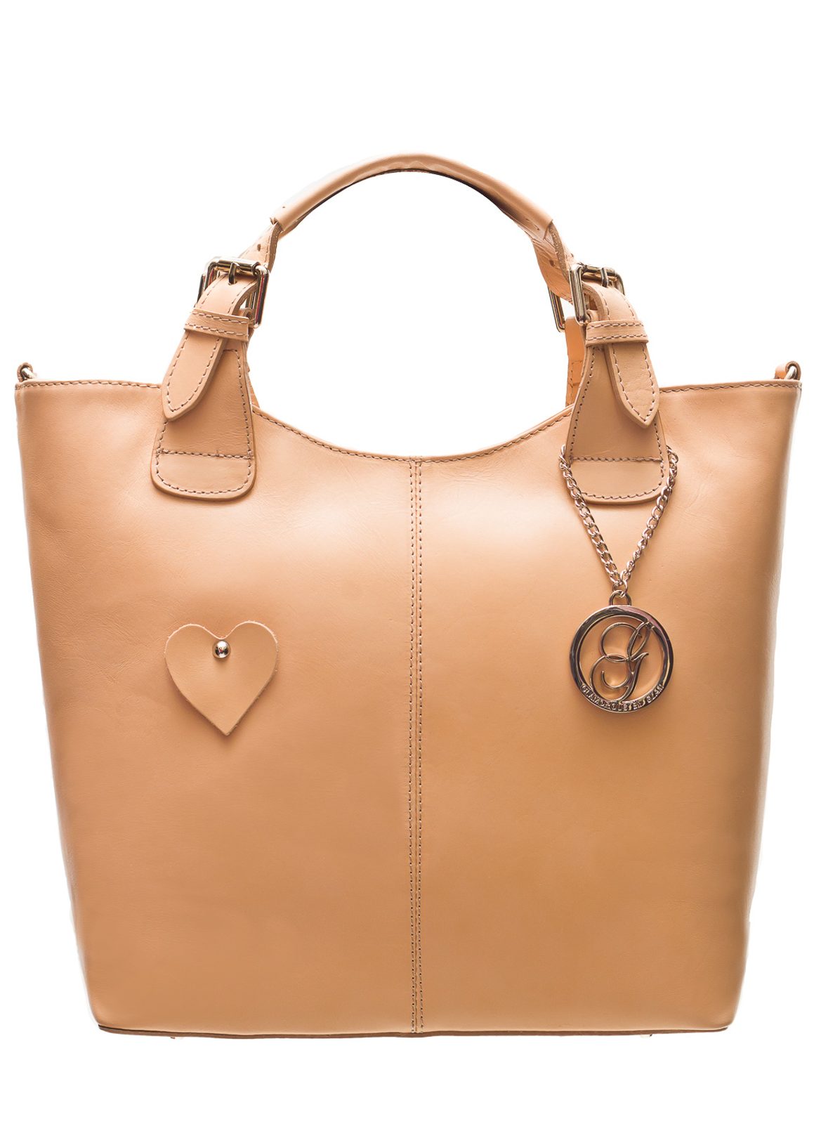 Dámská elegantní kabelka v béžové barvě. Kabelka je z pravé kůže, drží tvar a je velice praktická, vejde se do ní i formát A4. Kabelku lze nosit v ruce. Zapínání je na zip. Přední strana je doplněna malým srdíčkem - jedná se o limitovanou edici. Na zadní straně je malá kapsička, která je také na zip. Poutka jsou dozdobena přezkami a z jedné strany logem Glamorous by Glam. Doplňky jsou na kabelce stříbrné. Kabelka je vhodná k nošení k elegantnímu outfitu, do práce či do města.