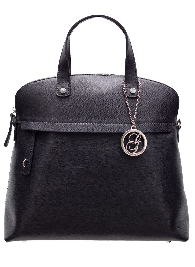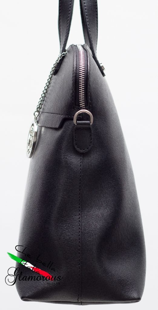 Dámská elegantní kabelka v černé barvě. Kabelka je celá kožená a má pevný tvar. Zapínání je na zip a poutka má krátká do ruky. Na přední straně je kapsička na zip. U poutka je logo Glamorous by Glam. Vhodná je i k elegantnímu outfitu, do práce i do města. Součástí kabelky je i přídavný track.