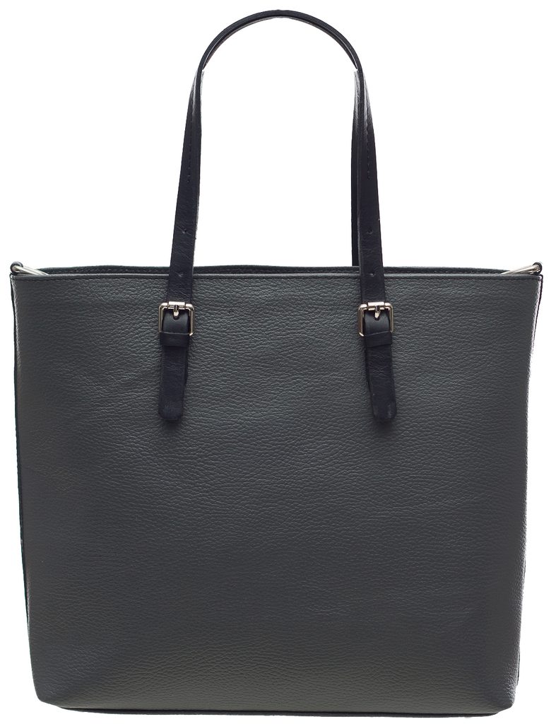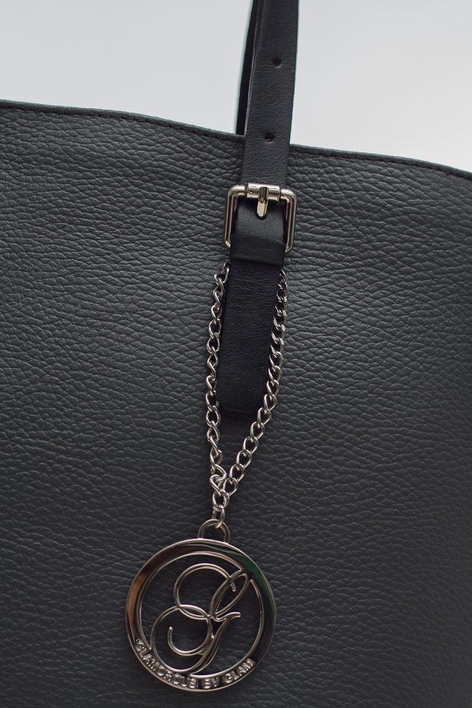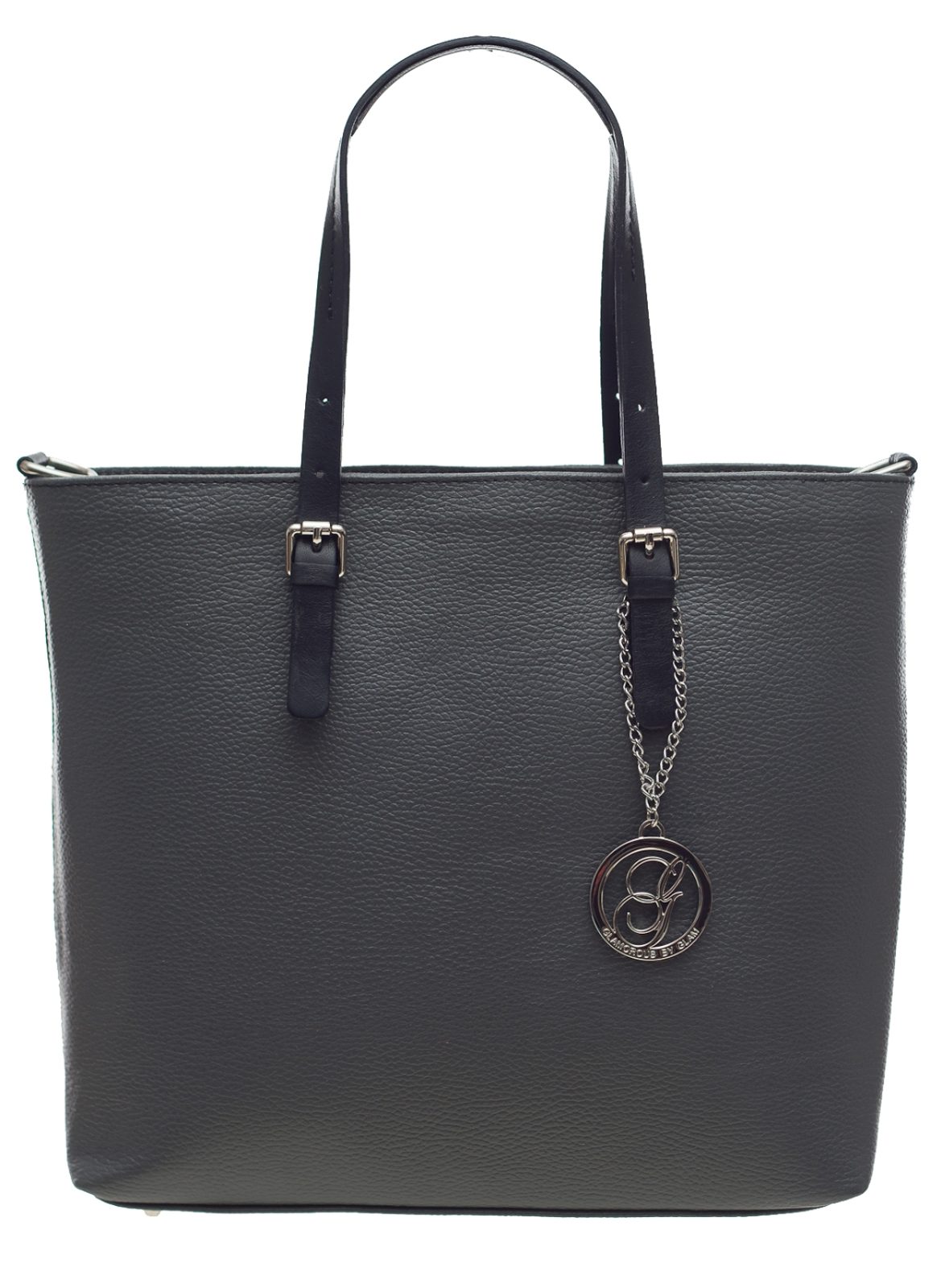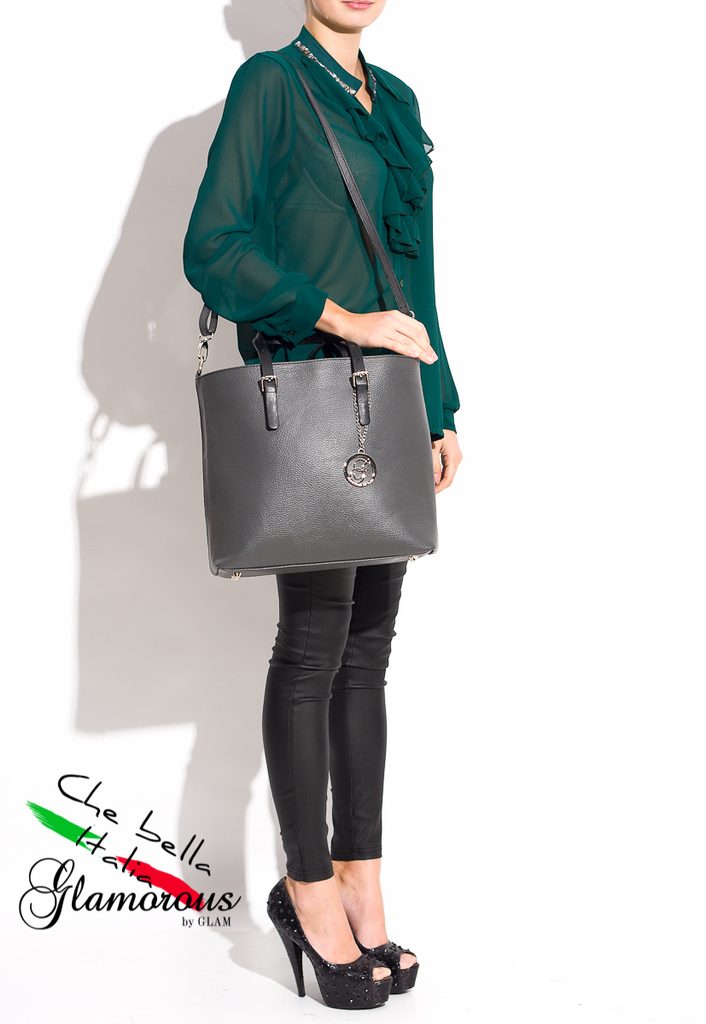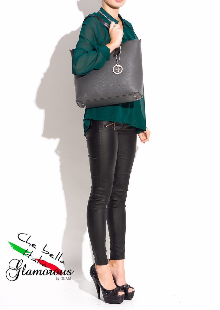 Dámská elegantní kabelka v šedé barvě. Celá kožená, krátké poutka do ruky. Do kabelky se vejde i formát A4. Na koncích poutek je stříbrné zapínání. Na přední straně je na ozdobu logo Glamorous by Glam. Kabelka je vhodná k nošení v ruce a hodí se jak do města tak i do práce.