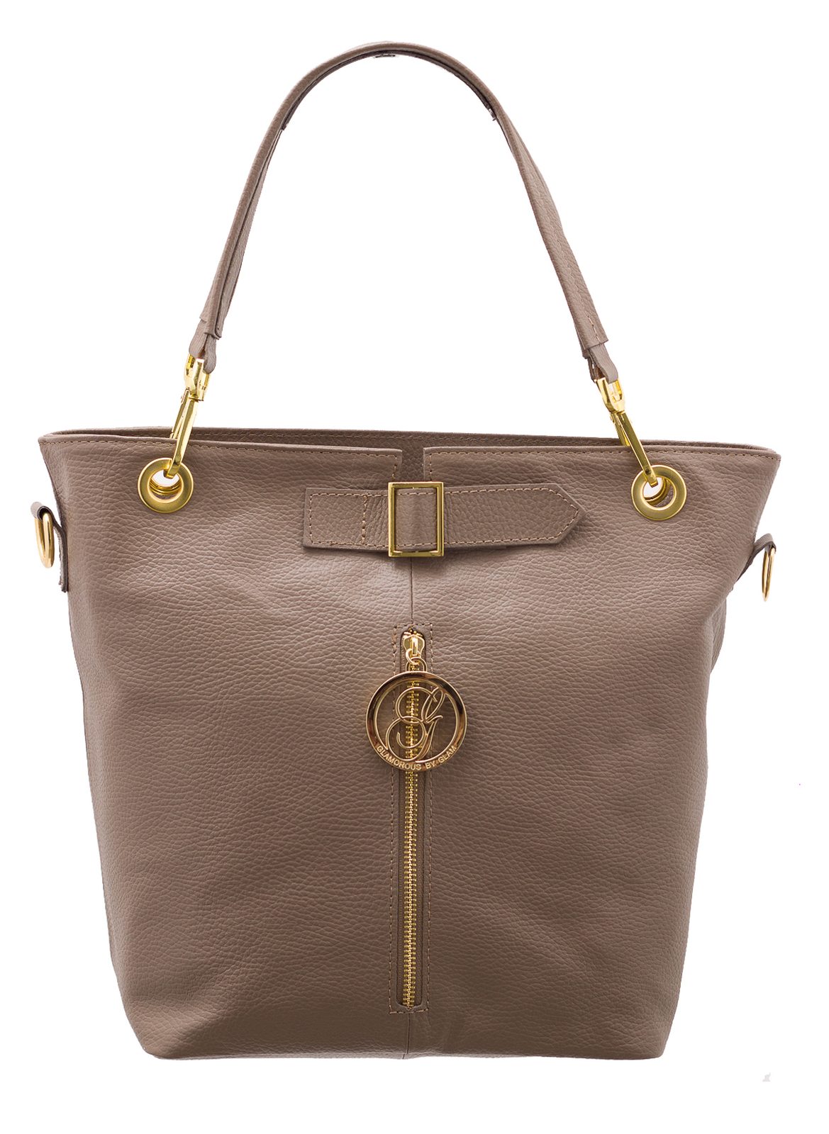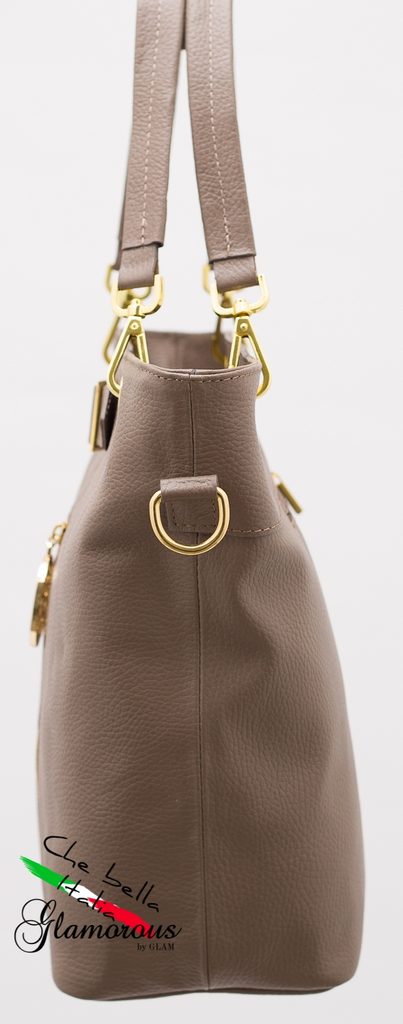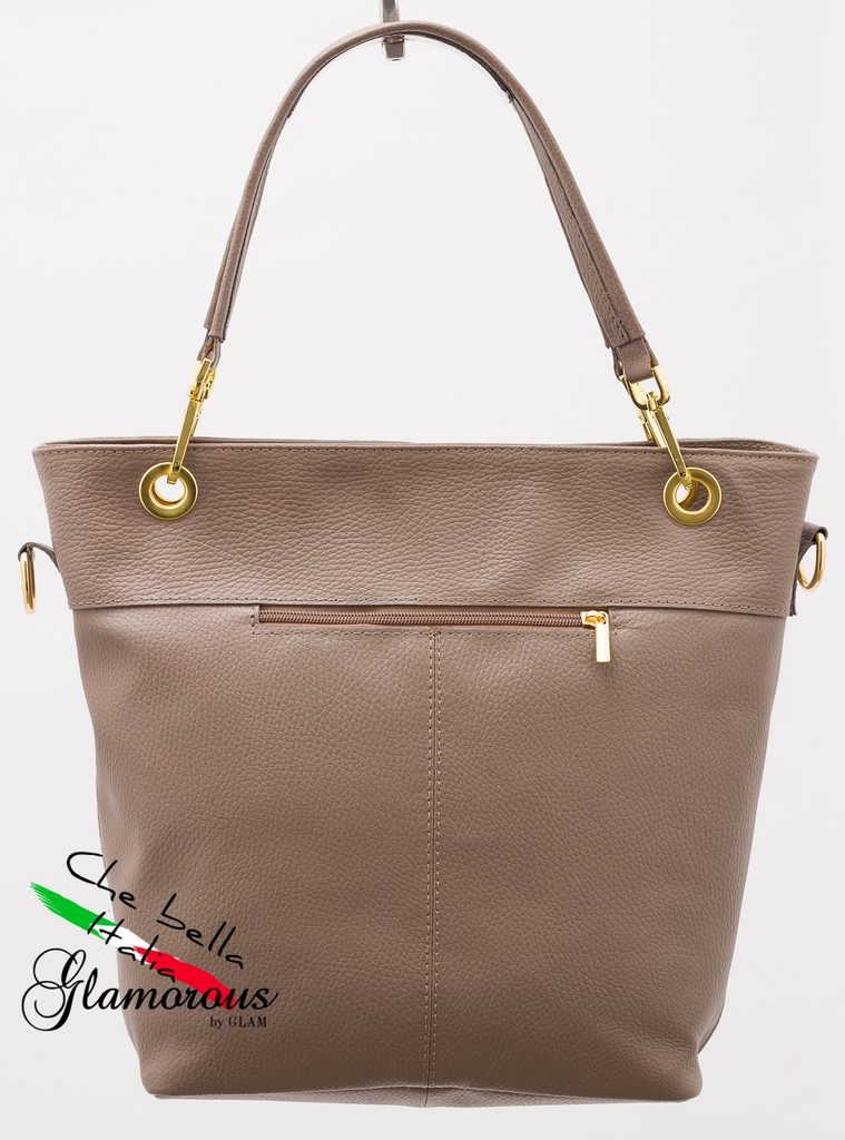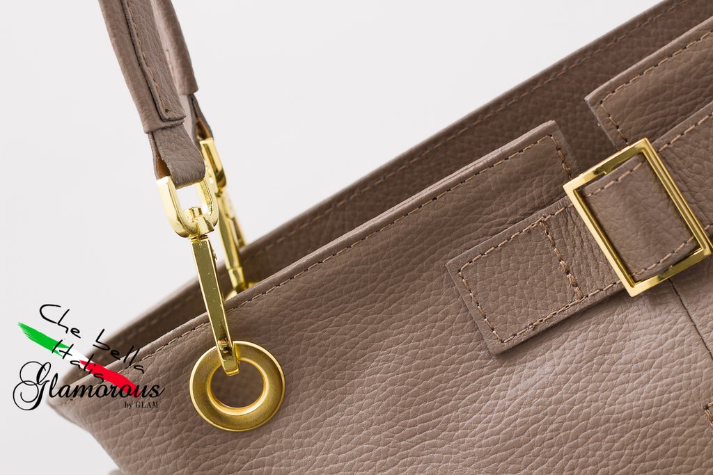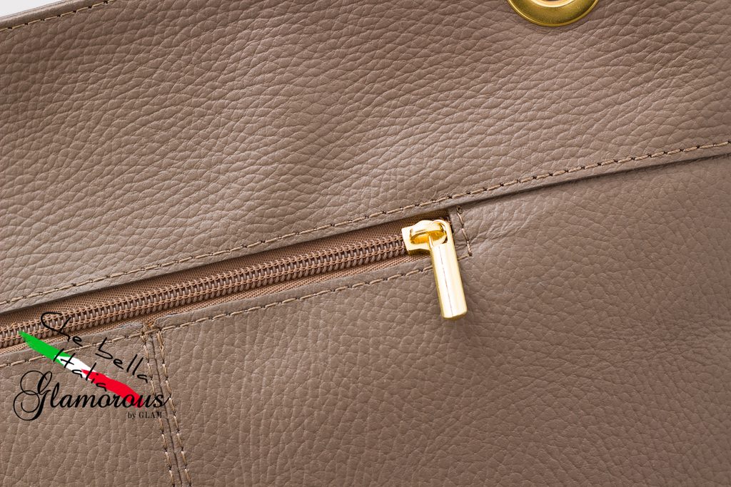 Dámská elegantní kabelka v béžové barvě. Celá kožená, krátké poutka do ruky i přes rameno. Na přední straně zlatá spona a pod ní zlatý zip s logem Glamorous by Glam. Kabelka má na zadní straně kapsičku na zip. Vhodná k nošení v ruce i přes rameno hodí se do města tak i do práce.
