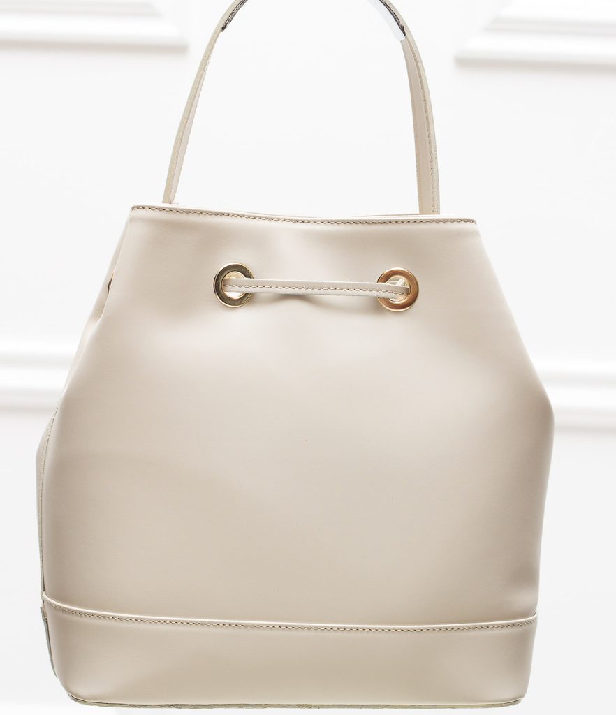 Dámská elegantní kabelka v béžové barvě. Kabelka je celá z matné pravé kůže, drží tvar. Kabelka má krátké poutko pro nošení v ruce. Zapínání je řešeno na zip. Přední část je dozdobena stahovací koženou sňůrkou, která má na koncích třásně. Nechybí zde ani zlaté logo Glamorous by Glam. Kabelka je velmi nápaditá svým tvarem. Kabelka je vhodná k nošení do města, pro volné chvíle i do práce jak elegantnímu i sportovnímu outfitu. Součástí kabelky je i přídavný track.