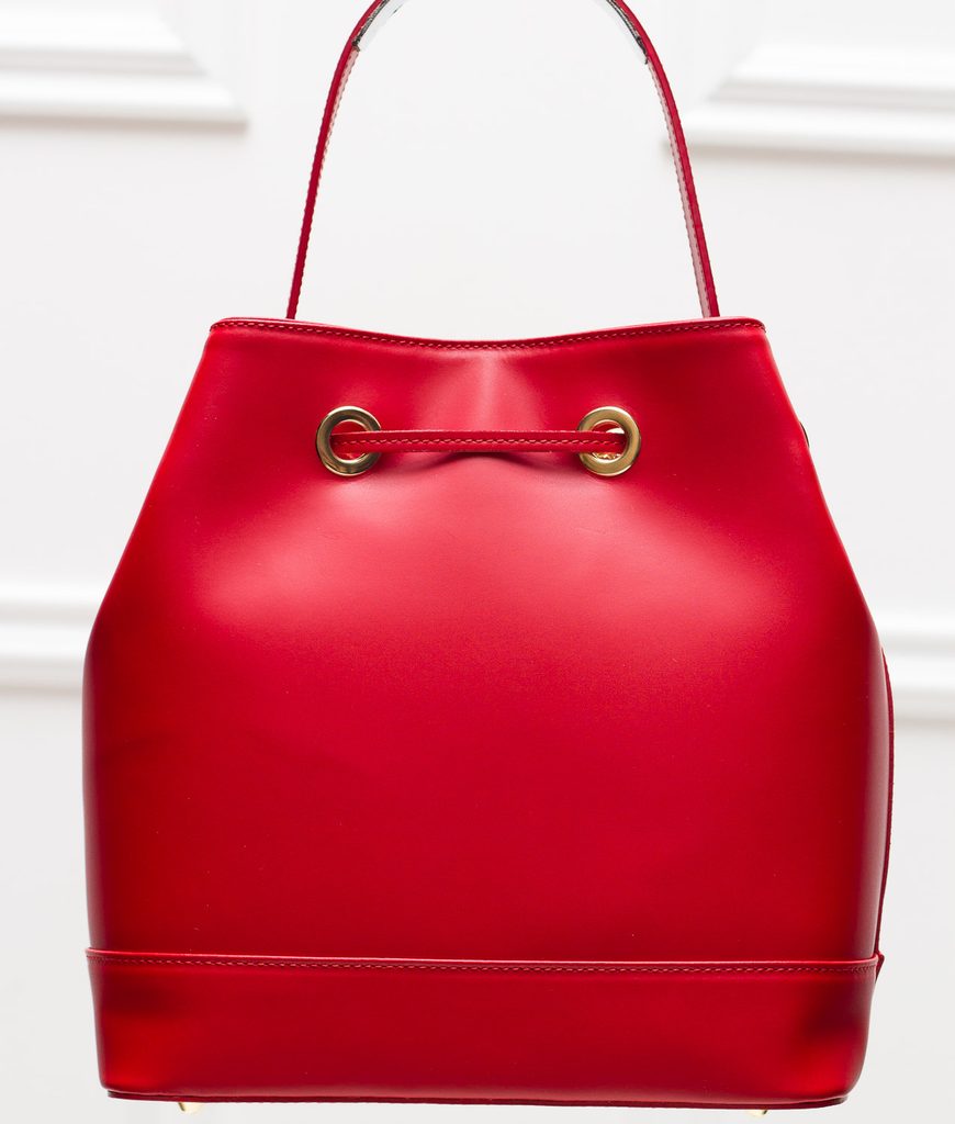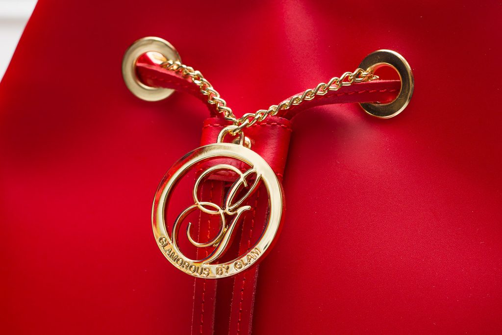 Dámská elegantní kabelka v červené barvě. Kabelka je celá z matné pravé kůže, drží tvar. Kabelka má krátké poutko pro nošení v ruce. Zapínání je řešeno na zip. Přední část je dozdobena stahovací koženou sňůrkou, která má na koncích třásně. Nechybí zde ani zlaté logo Glamorous by Glam. Kabelka je velmi nápaditá svým tvarem. Kabelka je vhodná k nošení do města, pro volné chvíle i do práce jak elegantnímu i sportovnímu outfitu. Součástí kabelky je i přídavný track.
