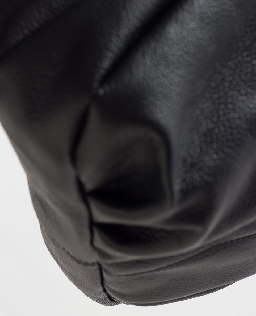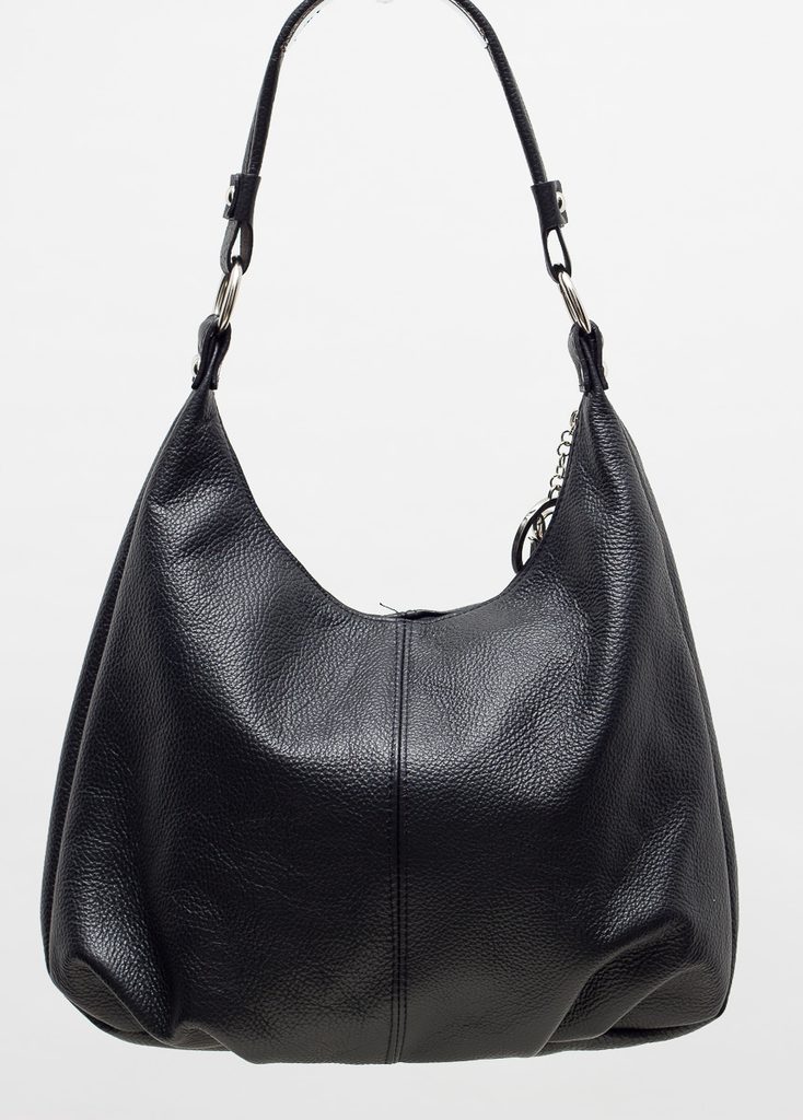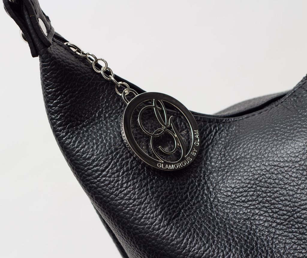 Dámská sportovní/elegantní kabelka v černé barvě. Kabelka je z pravé kůže ve tvaru vaku. Kabelka má jedno velké poutko přes rameno, na kterém jsou stříbrné kruhy. Zapínání je řešeno na zip, u kterého je na ozdobu stříbrné logo Glamorous by Glam. Do kabelky se vejde i formát A4. Vhodná k nošení do města, pro volný čas i do práce.