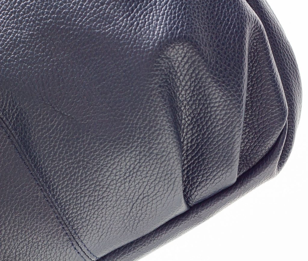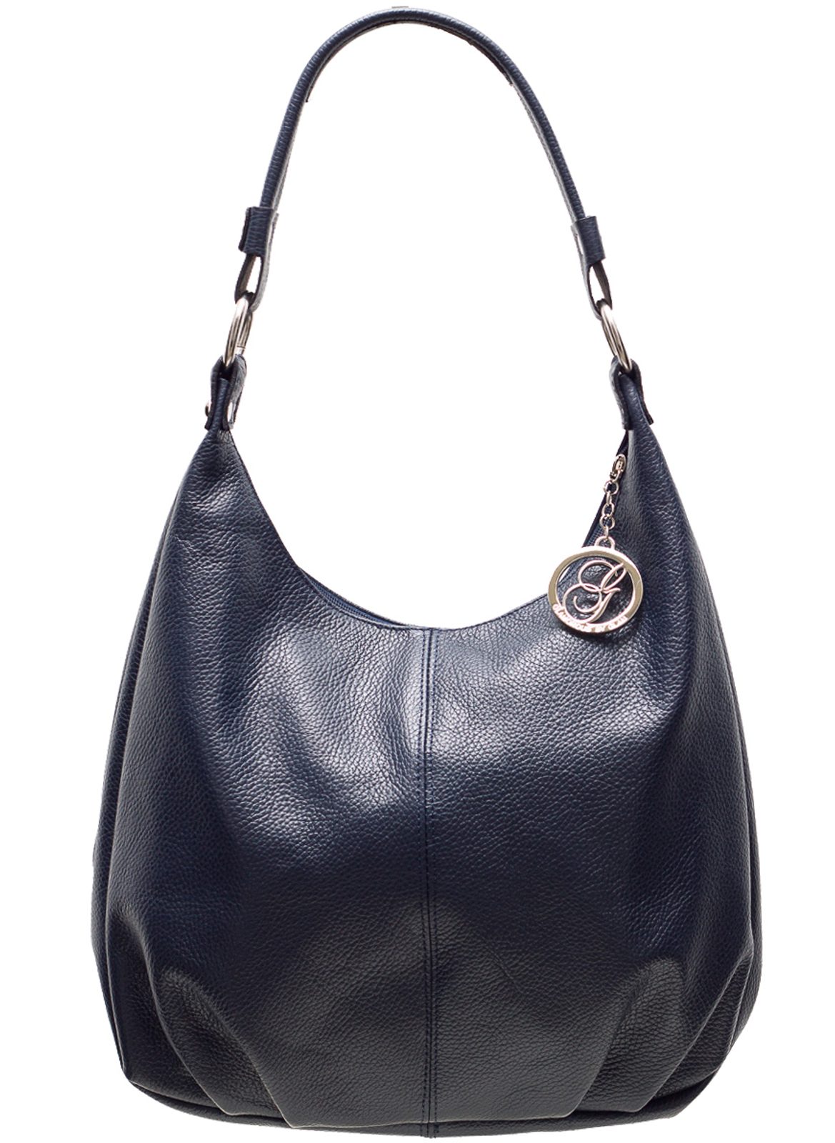 Dámská sportovní/elegantní kabelka v modré barvě. Kabelka je z pravé kůže ve tvaru vaku. Kabelka má jedno velké poutko přes rameno, na kterém jsou stříbrné kruhy. Zapínání je řešeno na zip, u kterého je na ozdobu stříbrné logo Glamorous by Glam. Do kabelky se vejde i formát A4. Vhodná k nošení do města, pro volný čas i do práce.