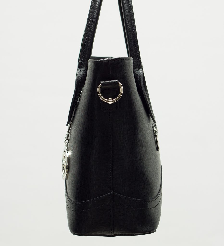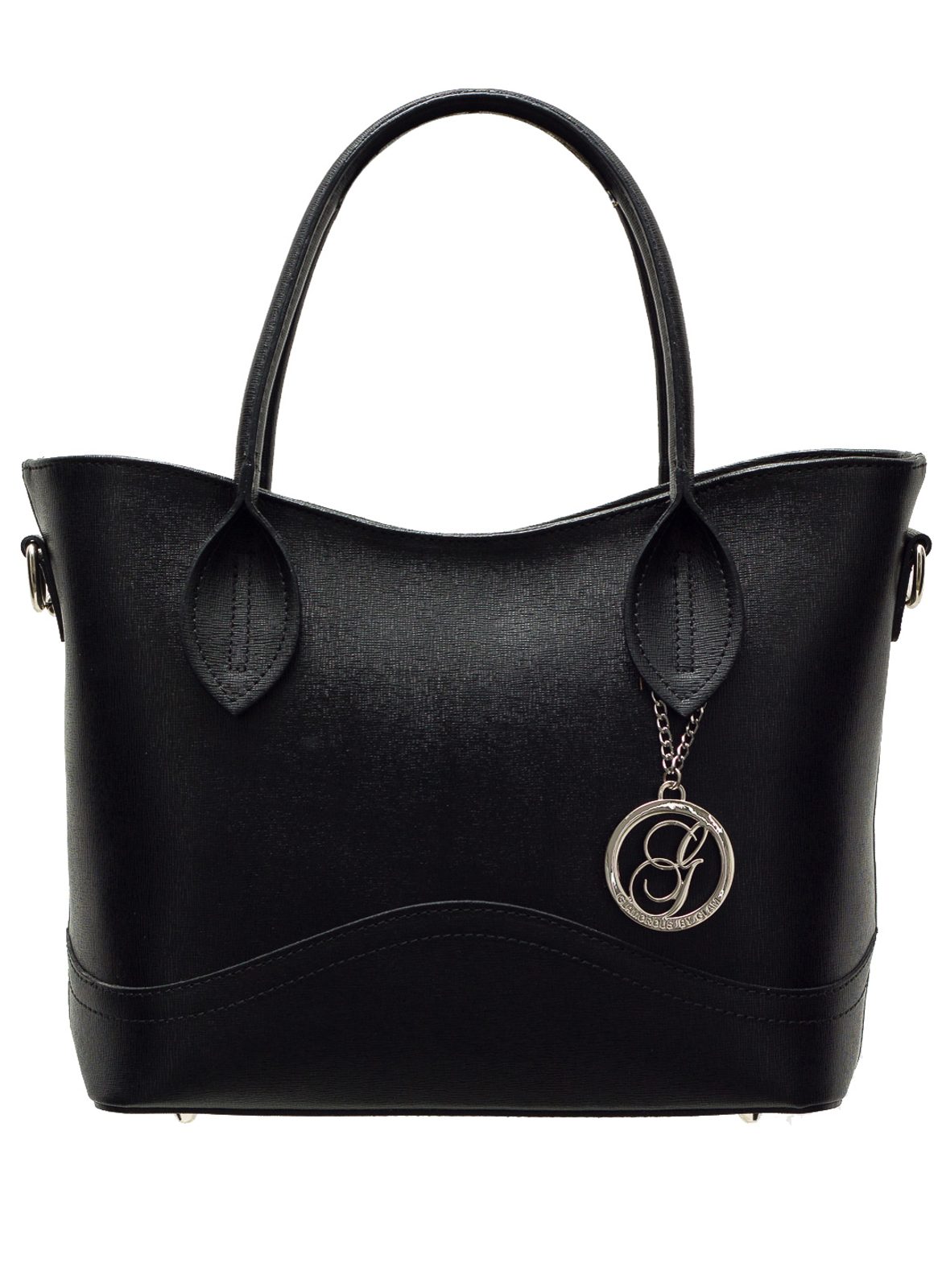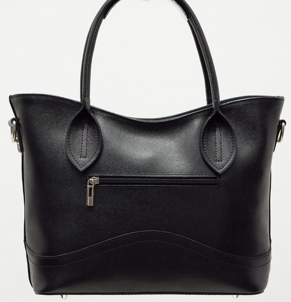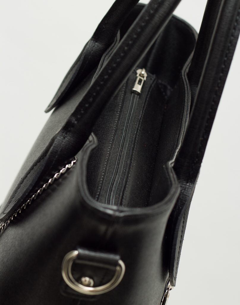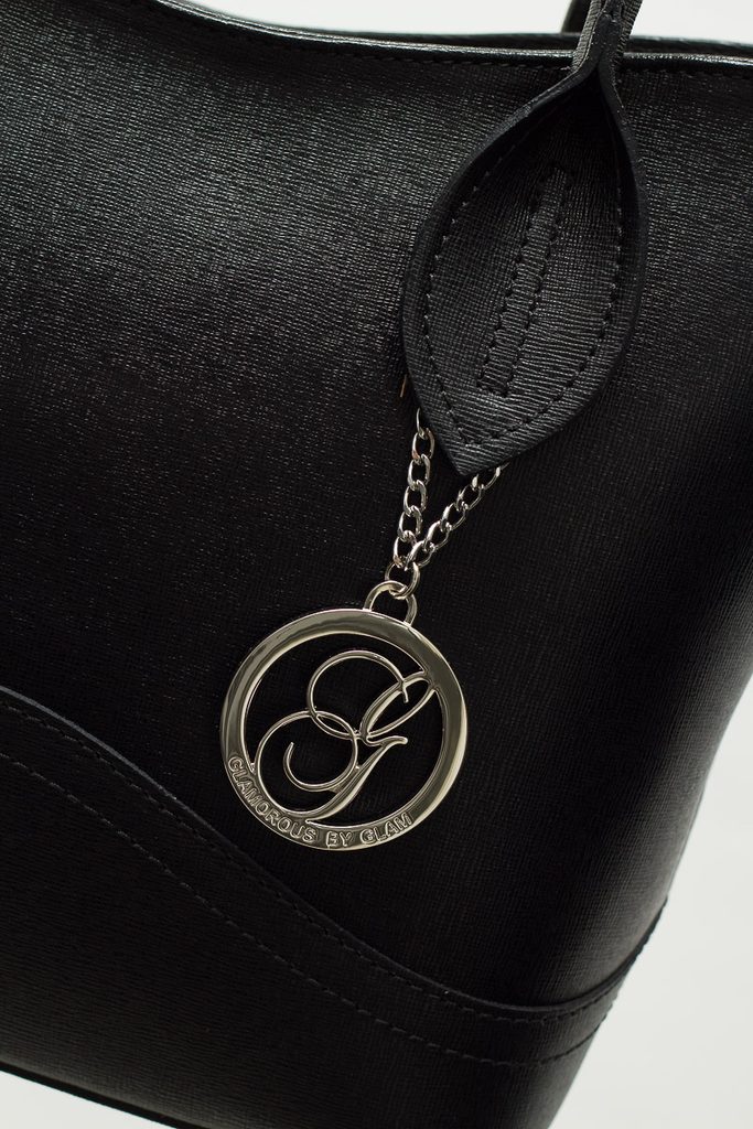 Dámská elegantní kabelka v černé barvě. Kabelka je celá ze safiánové pravé kůže, drží tvar. Kabelka má krátká poutka pro nošení v ruce. U poutka zdobí kabelku střírbné logo Glamorous by Glam. Na zadní straně je kapsička na zip, která slouží na malé drobnosti. Zapínání kabelky je řešeno na zip. Kabelka je vhodná k nošení do města i do práce k elegatnímu outfitu. Součástí kabelky je i přídavný track.