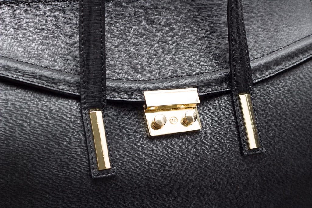 Dámská elegantní kabelka v černé barvě. Kabelka je celá kožená, safiánová struktura kabelky, drží tvar. Kabelka má zlaté zapínání, které funguje tak, že se kolečka přitisknou k sobě, tím se kabelka otevře. Uzavření kabelky stačí jen zacvaknout. U poutek má kabelka zlaté zdobení. Kabelka se nejvíce hodí k elegantnímu outfitu, do města i do práce.