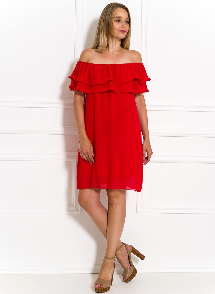 Dámské letní šaty s volánem v červené barvě. Šaty jsou šifonové, mají široký volán přes ramena. Šaty nemají ramínka. Střih šatů je volný a vzdušný. Ideální na letní horké večery. Šaty krásně vypadají na těle. Vhodné jsou k nošení do města i pro volné chvíle.