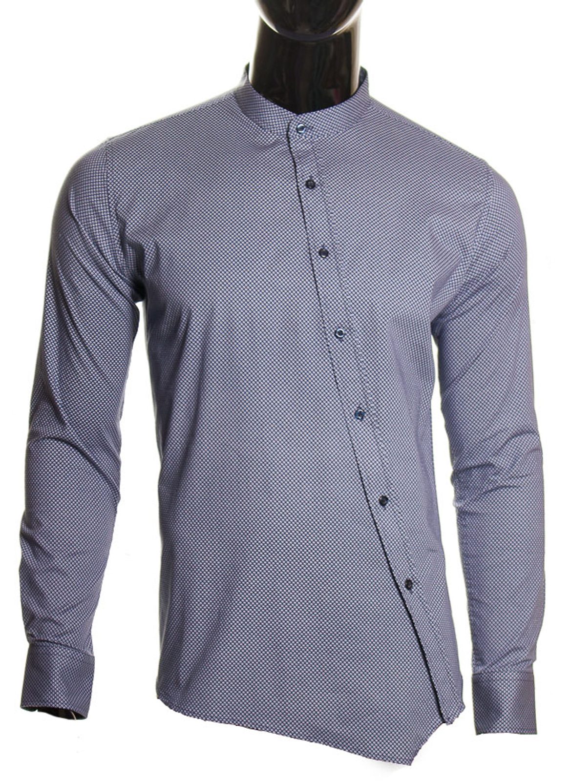 Pánská elegantní košile v modré barvě s jemným vzorem. Košile je bez límečku, ale se stojáčkem. Knoflíky jsou asymetricky ušity k jedné straně. Zajímavým detailem je delší cíp u jedné strany. Košile se hodí jak ke společenskému outfitu, ale i k jeanám.