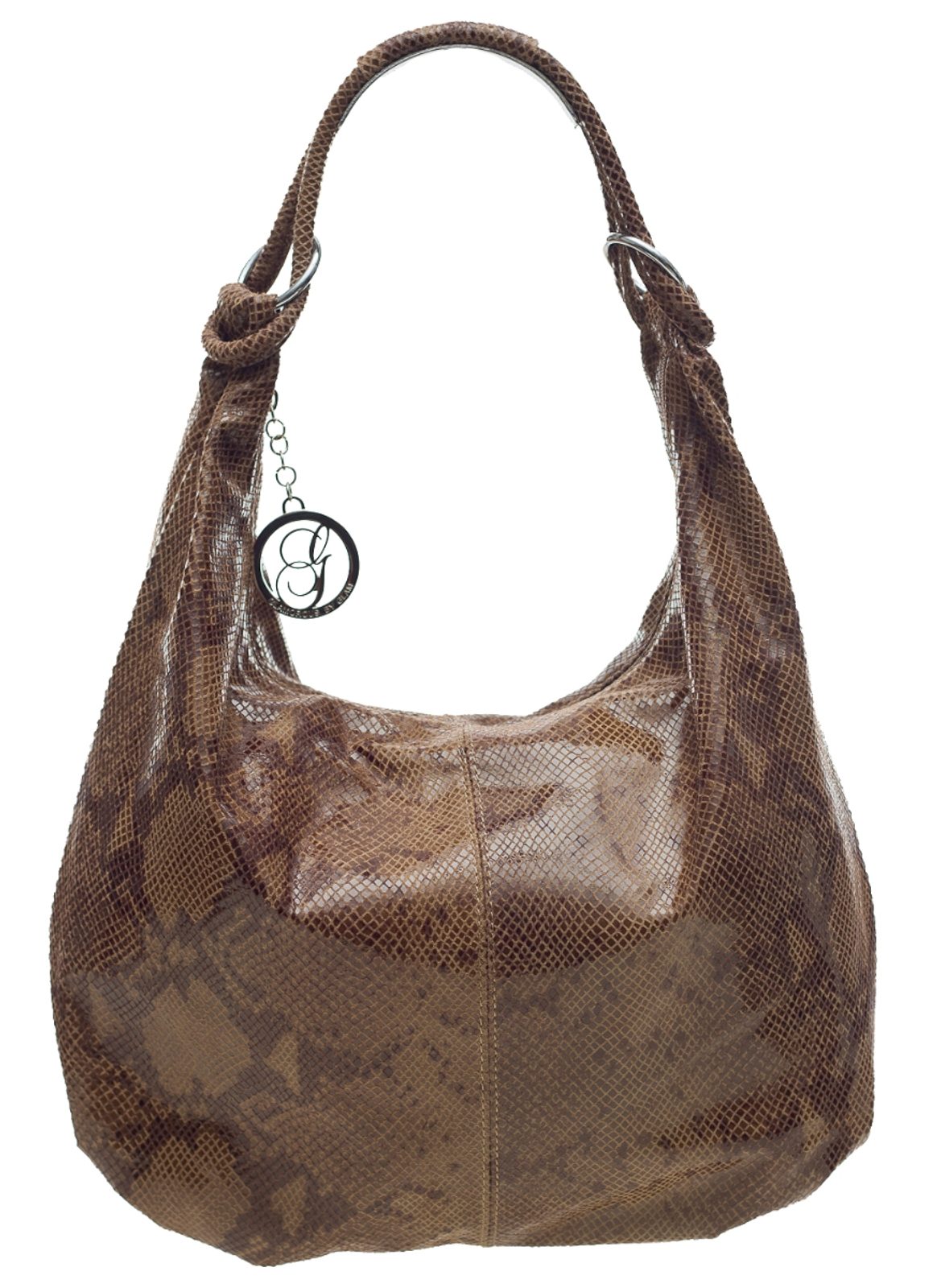 Dámská elegantní kabelka v béžovo - hnědé barvě. Kabelka je z velmi jemné pravé kůže s hadím vzorem. Má jedno velké poutko přes rameno, na kterém jsou stříbrné kruhy. Do kabelky se vejde i formát A4. Zapínání na zip, se stříbrnou ozdobou loga Glamorous by Glam.