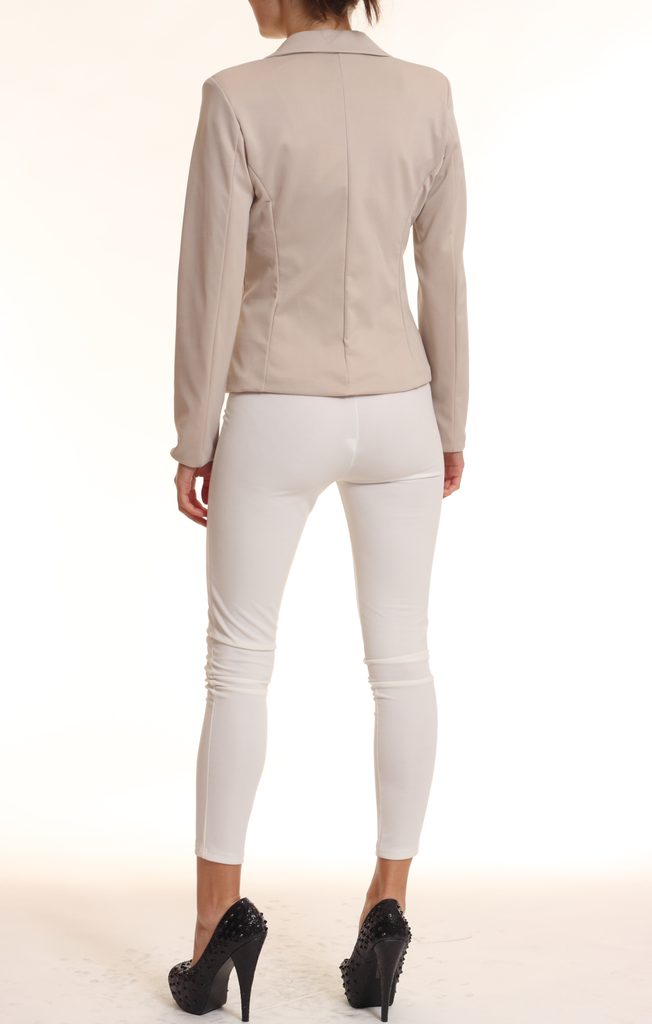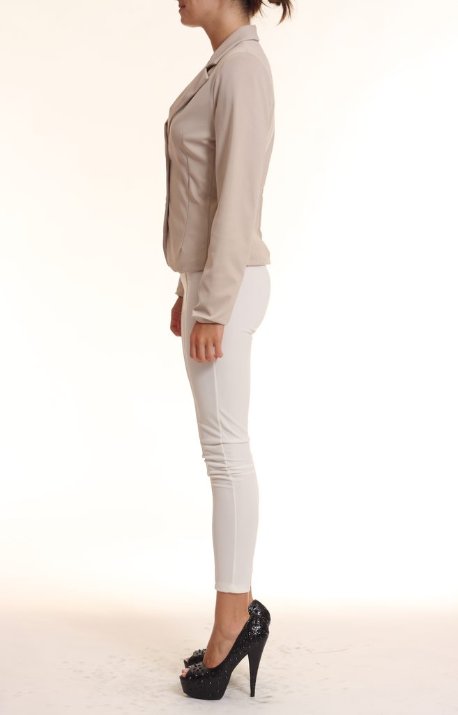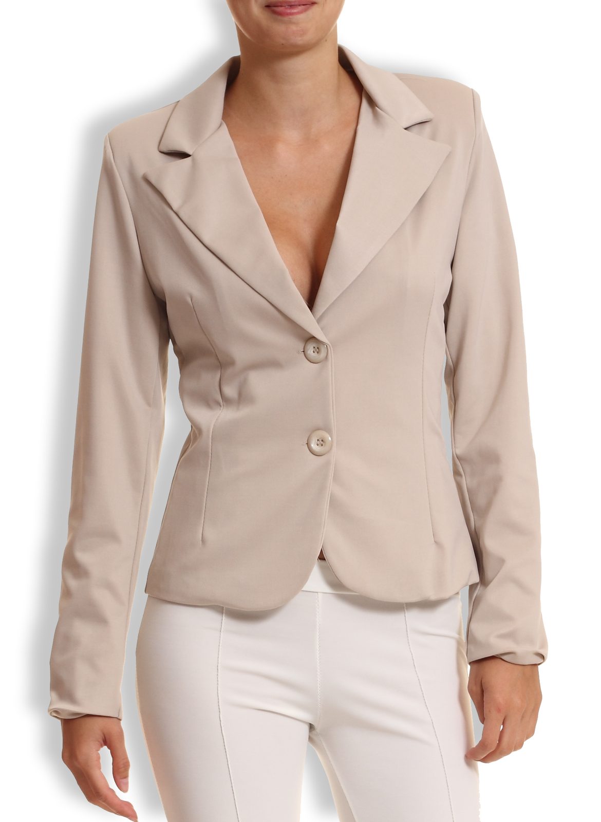 Dámské letní sáčko v béžové barvě. Sáčko je jednoduché, na ramenou jsou vycpávky. Zapínání na dva knoflíky. Vhodné ke kalhotám či jeanám, do práce i na společenské události.