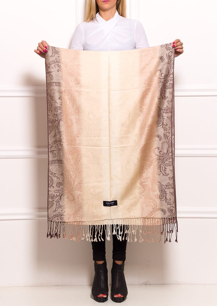 Dámská šála pašmínového typu s jemným vzorem a pruhy v béžové barvě.