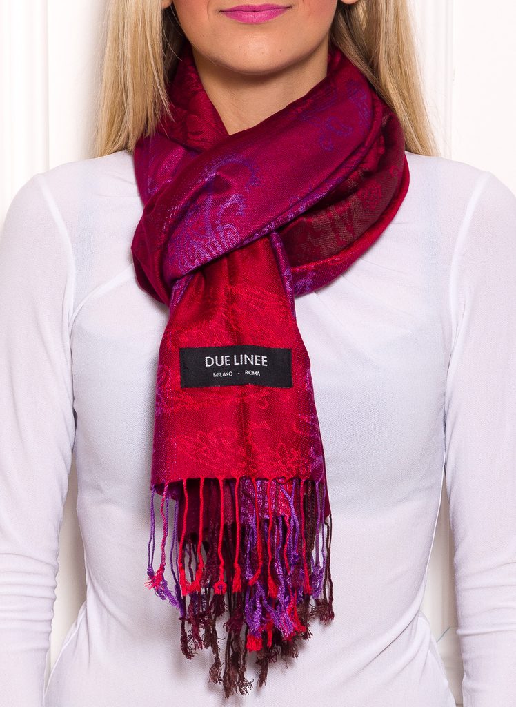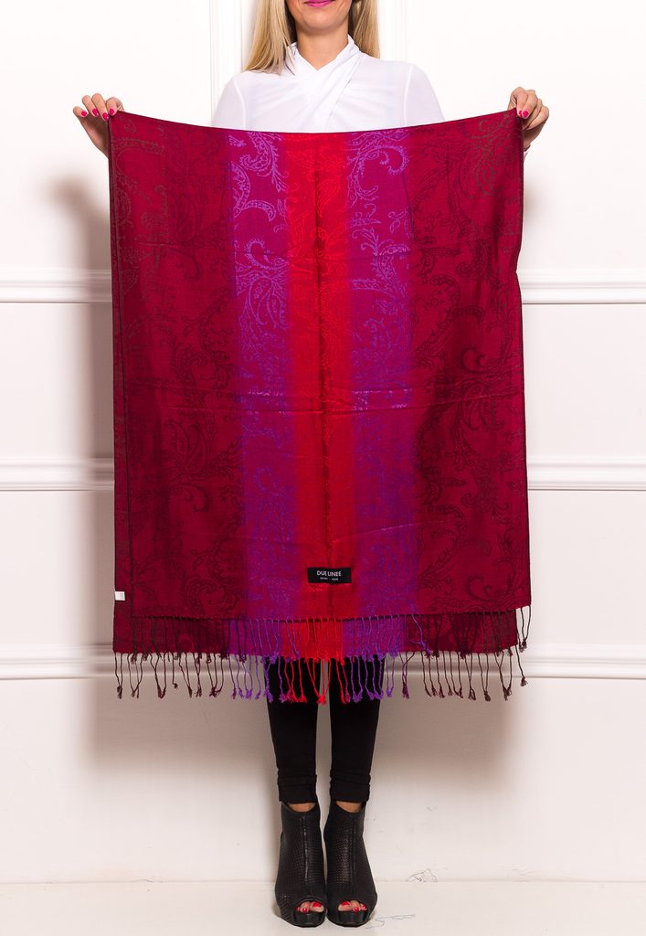 Dámská šála pašmínového typu s jemným vzorem a pruhy v červené barvě.