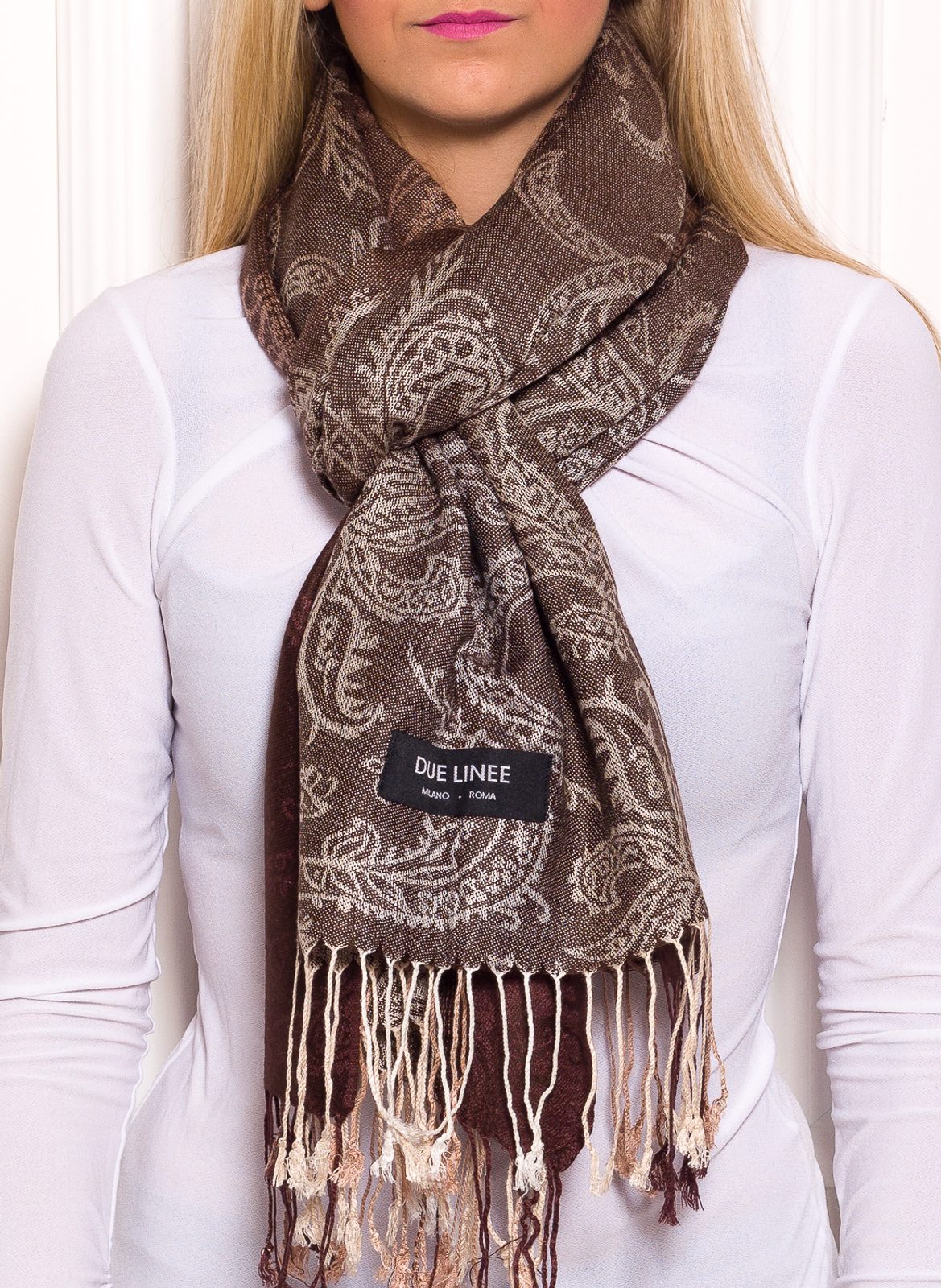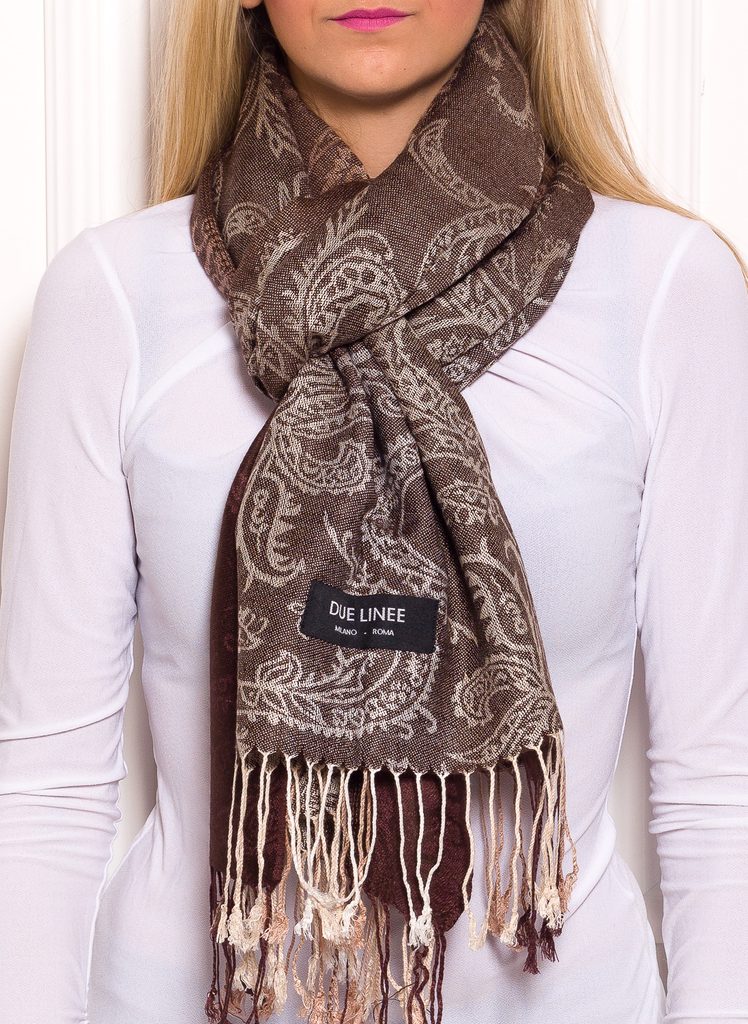 Dámská šála pašmínového typu s jemným vzorem a pruhy v hnědé barvě.
