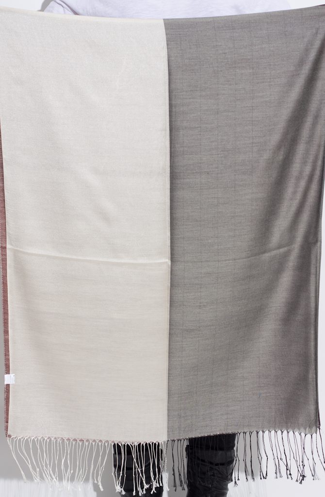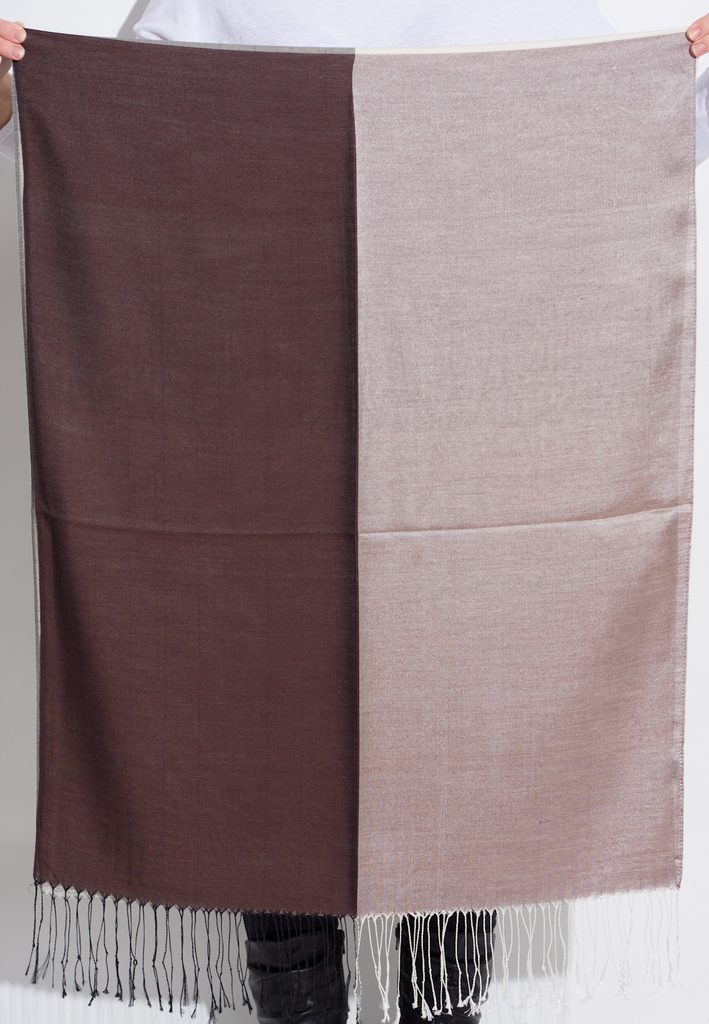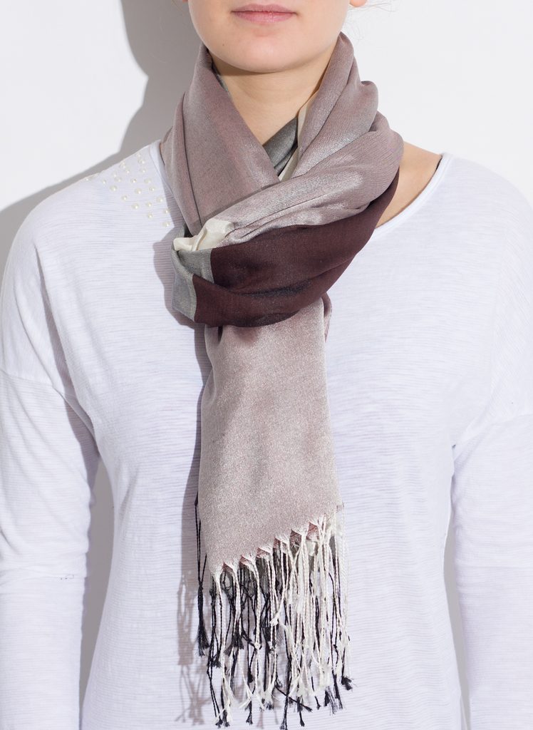 Dámská šála s přjemného materiálu s širokými pruhy na každé straně v hnědo-šedé barvě.