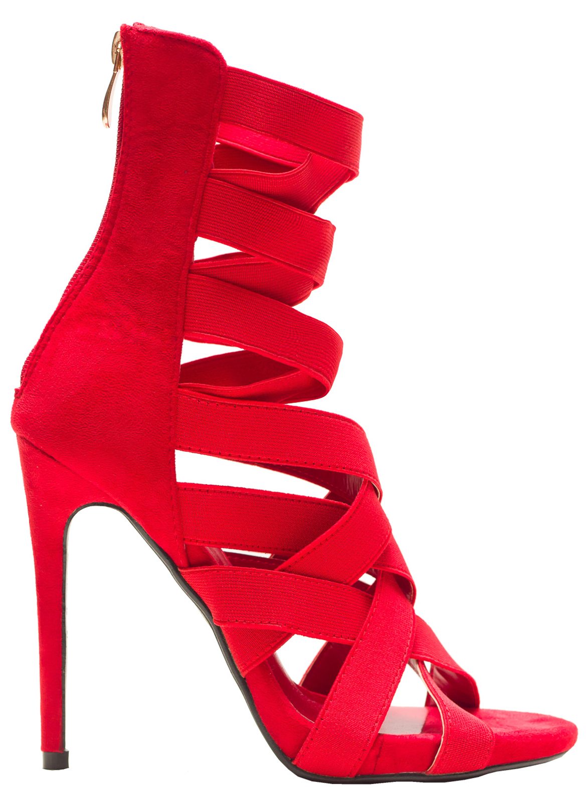 Dámské luxusní páskové boty v červené barvě. Boty mají celou přední stranu z elastických pásků. Zadní strana je pevnější a drží tvar. Na patě mají boty zlatý zip. Boty jsou zajímavé svým střihem a vypadají skvostně na noze. Hodí se k šatům i k úzkým kalhotám. Boty jsou dodávány bez krabice.