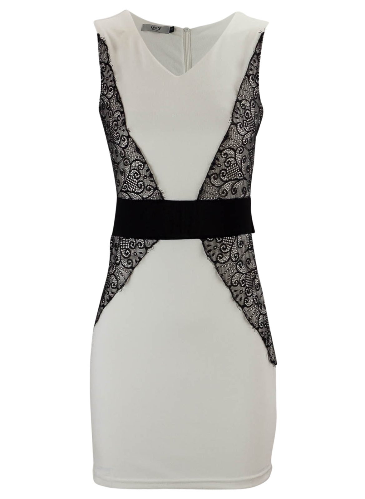 Dámské elegantní krátké šaty v bílé barvě s krajkou. Šaty mají výstřih do ,,V". Na bocích z každé strany je černá krajka, která dodá šatům elegantnost. Zapínání mají šaty na zip. Skvěle sedí, příjemný materiál. Vhodné do práce, do města i na společenskou událost.