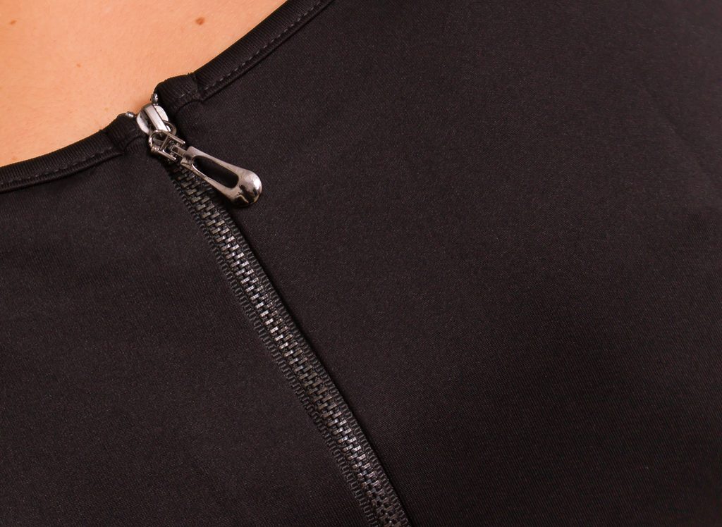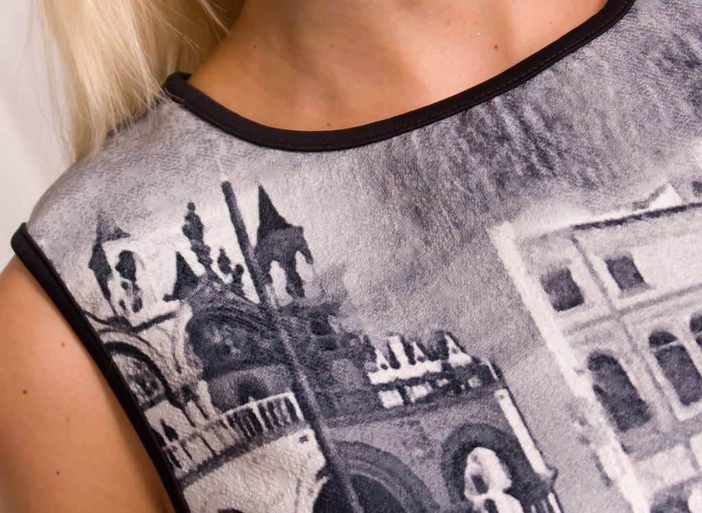 Dámské elegantní černé šaty s motivem. Šaty mají široká ramínka, kulatý výstřih. Zapínání je řešeno na zip, který je na zádech. Zajímavým motivem na šatech je město. Šaty skvěle sedí, příjemný materiál. Vhodné do práce, do města i na společenskou událost.