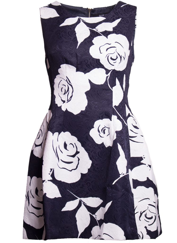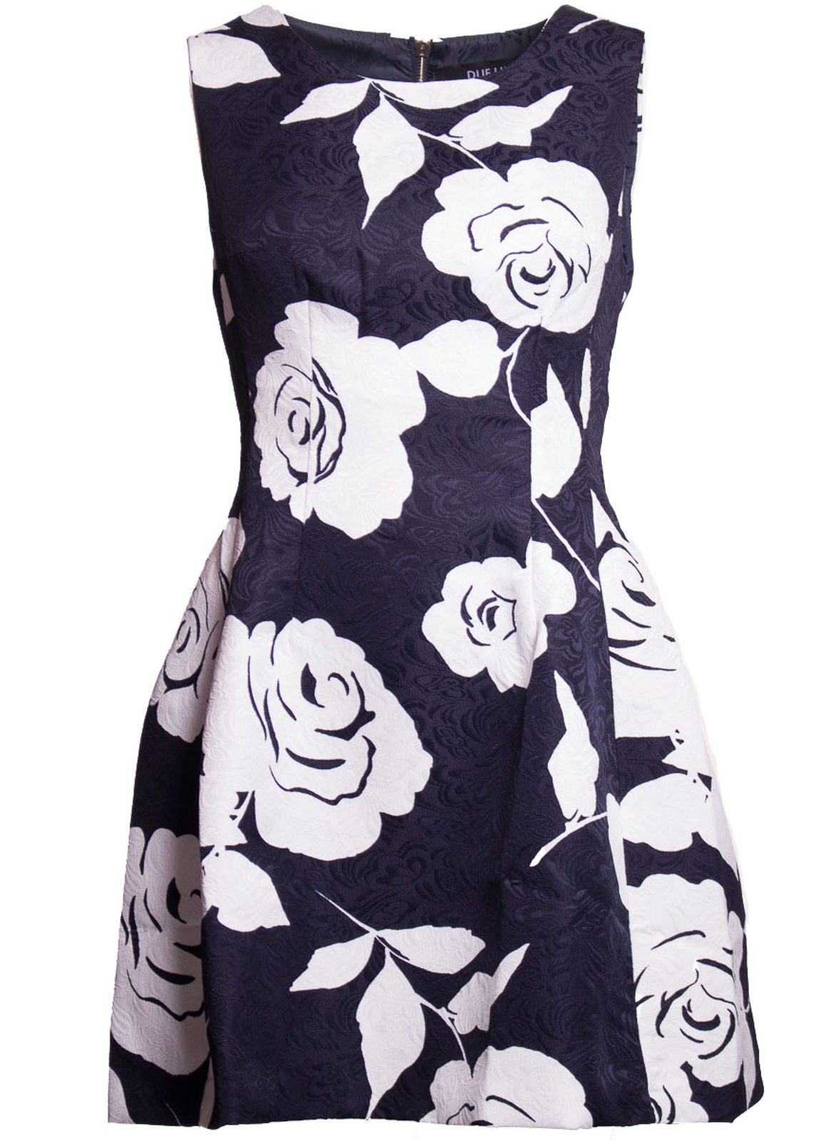Dámské elegantní šaty s květy v modro - bílé barvě. Šaty mají široká ramínka, kulatý výstřih, ,,A" střih. Zapínání mají šaty řešeny na zip, který je na zádech. Vhodné do práce i na společenskou událost.
