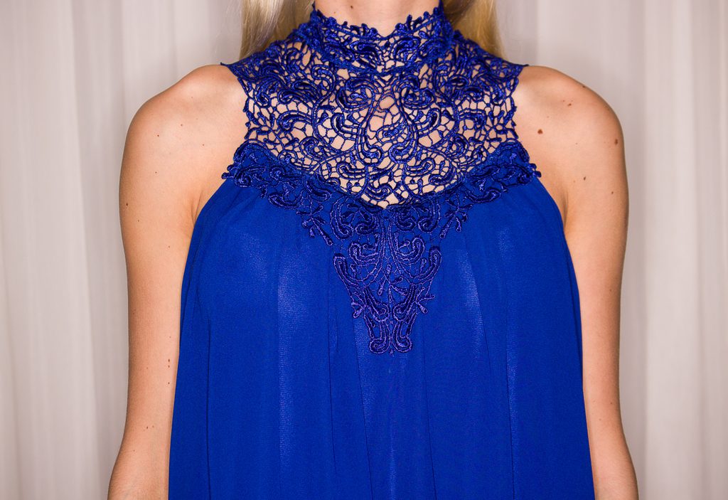 Dámské letní šaty s krajkou v královky modré barvě. Šaty jsou bez ramínek, volnější střih. Kolem krku až přes prsa zdobí šaty výrazná krajka, která zaujme na první pohled. Na zádech lze na dva knoflíky šaty zapnout. Součástí šatů je podšívka, která zabrání prosvítání. Šaty můžete vzít do města i pro volný čas, pro horké letní večery ideální outfit.