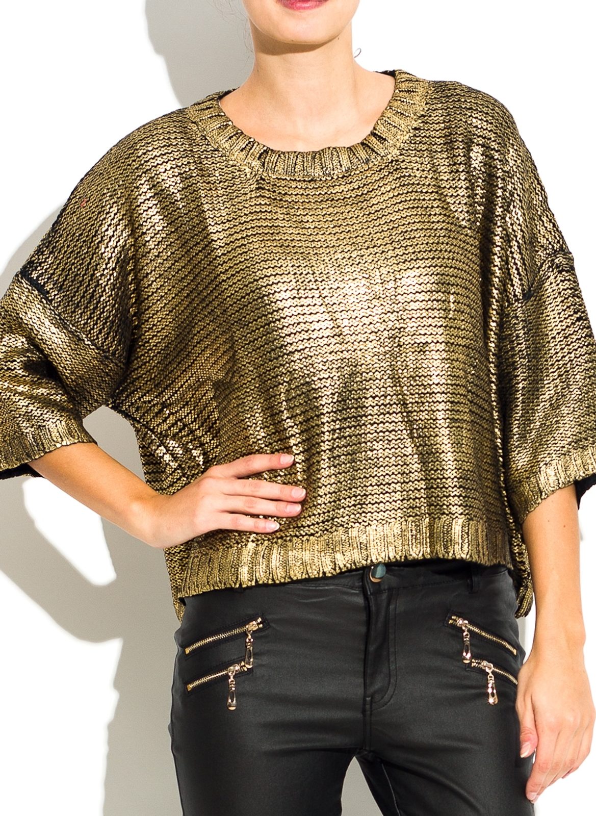 Dámský svetr v metalické barvě černo - zlaté. Svetr je krátkého a volného střihu. Má krátké rukávy a kulatý výstřih. Vhodný k legínám či úzkým kalhotám.