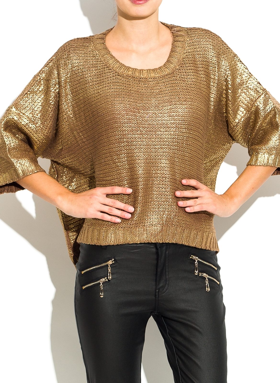 Dámský svetr v metalické barvě hnědo-zlaté. Svetr je krátkého a volného střihu. Má krátké rukávy a kulatý výstřih. Vhodný k legínám či úzkým kalhotám.