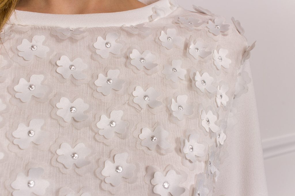 Dámská halenka s květy v bílé barvě. Halenka má kulatý výstřih, rukávy 3/4 délky. Zajímavým detailem halenky je přední část, která se skládá z malých drobných kytiček. Halenka se hodí ke společenským kalhotám, úzkým jeanám i k sukni. Vhodné k nošení do města i pro volný čas.