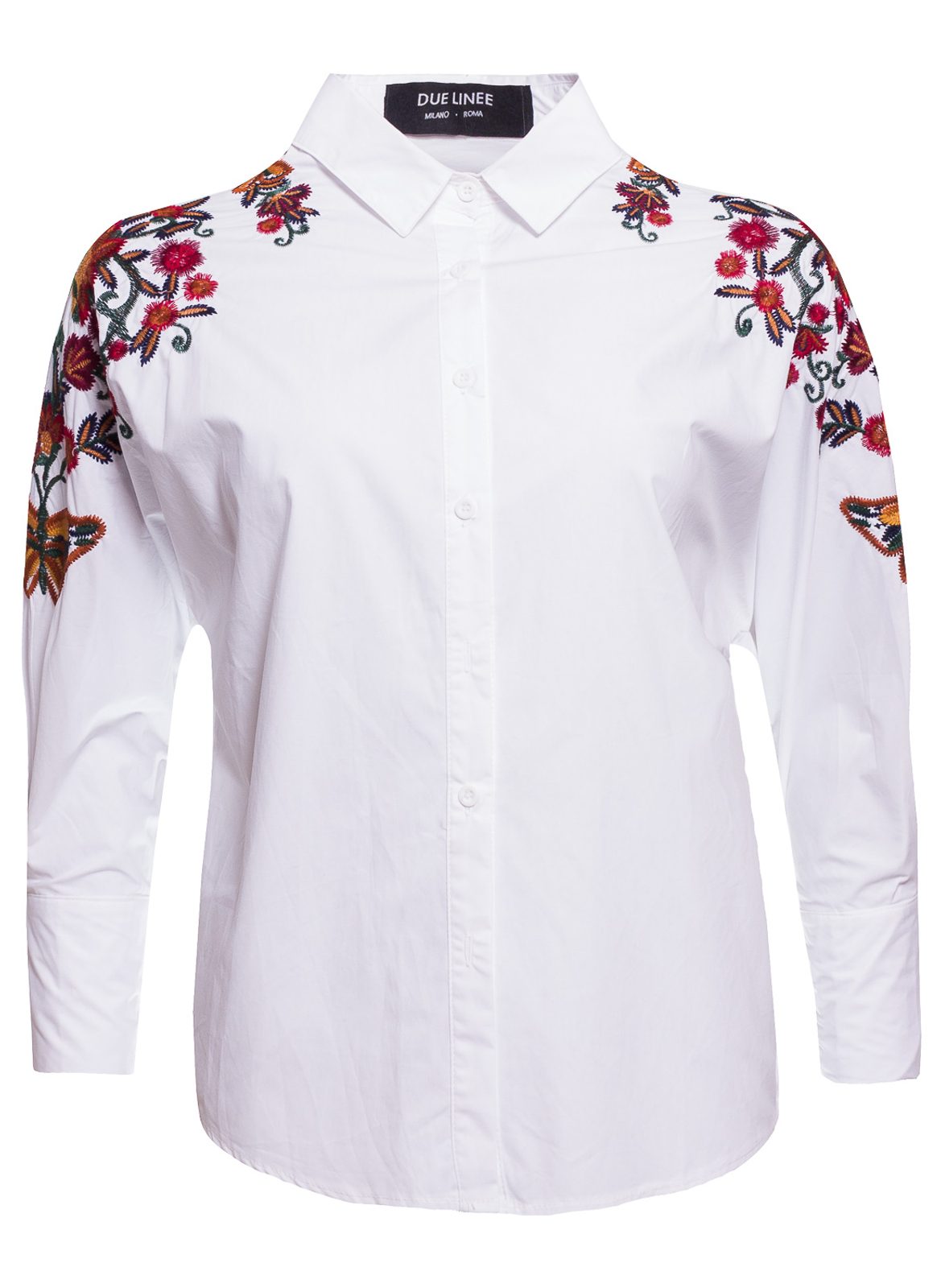 Dámská elegantní košile v květy v bílé barvě. Košile má dlouhé rukávy a límeček kolem krku. Košile má volnější oversize střih. Na zadní straně je košile nařasena kolem zad přes prsa. Zapínání je řešeno na malé knoflíčky. Rukávy mají zapínání také na knoflíčky. Halenka má zajímavý detail barevných květů, které jsou na ramenou. Halenka se hodí k barevných jeanám, do města i pro volné chvíle.