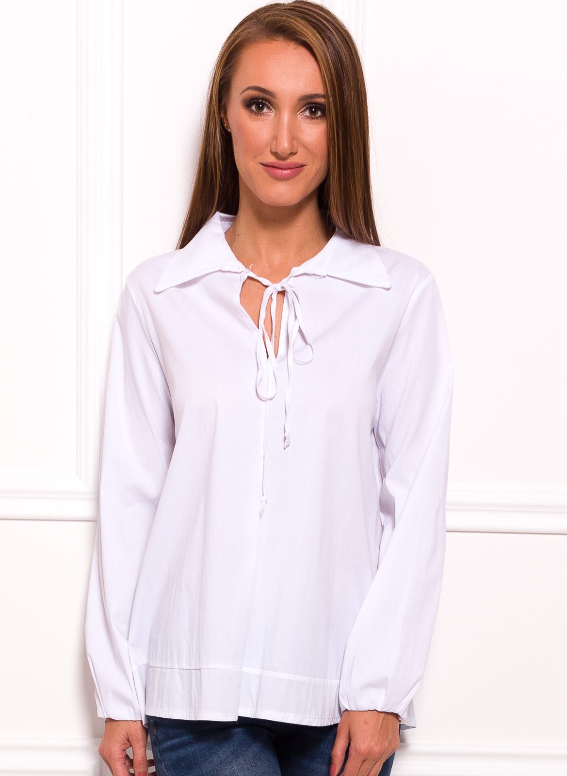 Dámská bílá košile se zavazováním. Klasická košile volnějšího ,,A" střihu. Košile má límeček a zavazování v dekoltu. Lze výborně kombinovat s úzkými kalhotami a vestičkou. Můžete jí vzít do města, do práce i pro volné chvíle.