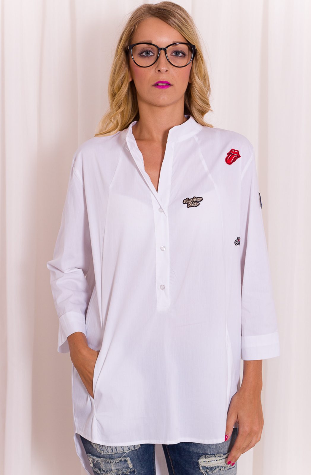 Dámská bílá košile s obrázky. Zapínání košile je řešeno klasicky na knoflíky jen do půlky délky košile, rukávy jsou 3/4 délky. Na bocích jsou všity kapsy. Zadní část je delší než přední. Na jedné straně košile a jednou rukávu jsou zajímavé malé obrázky. Košili lze kombinovat s úzkými jeanami či kalhotami. Můžete jí vzít do města, do práce i pro volné chvíle.