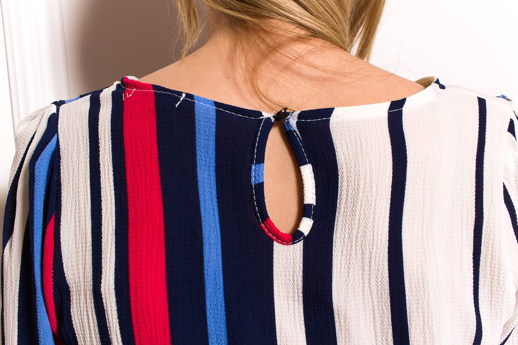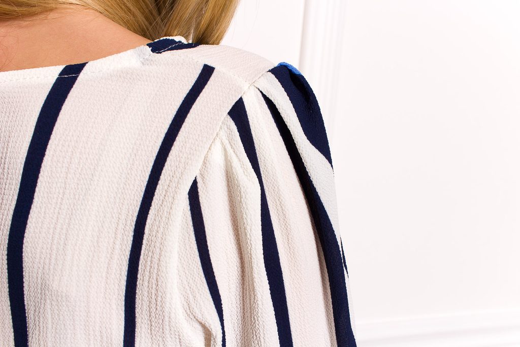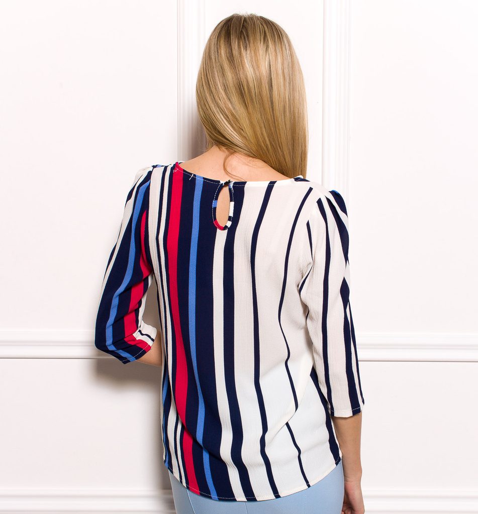 Dámská elegantní halenka s modrými pruhy. Halenka má 3/4 rukávy, kulatý výstřih. Zapínání má halenka na malý knoflíček, který je na zádech. Halenka se hodí ke společenským kalhotám či pouzdrové sukni. Vhodné do práce či na společenské události.