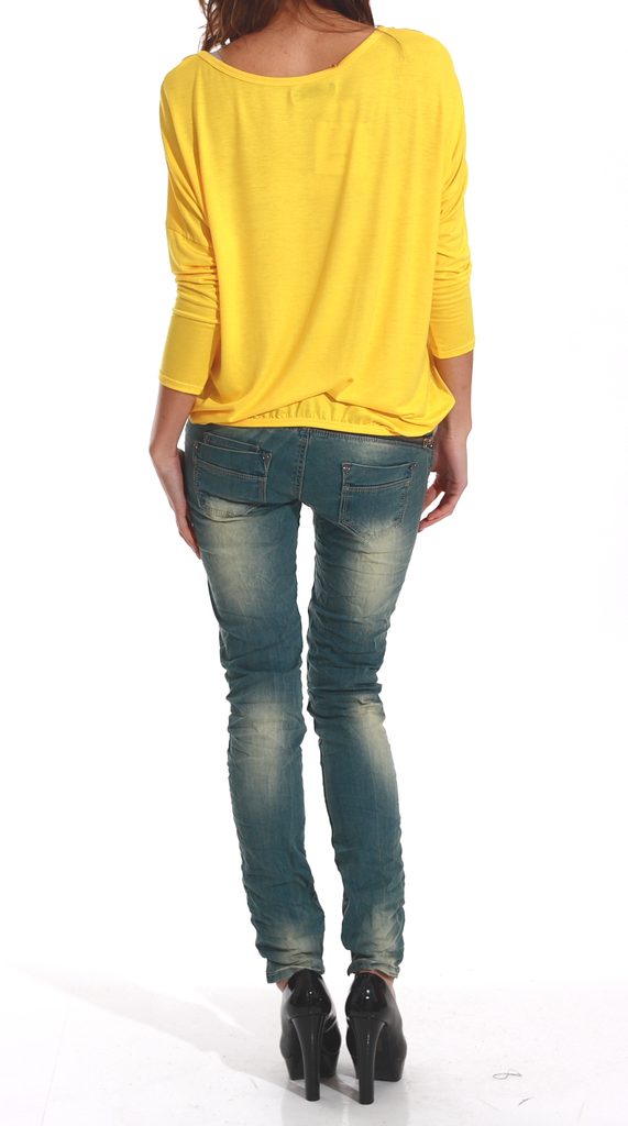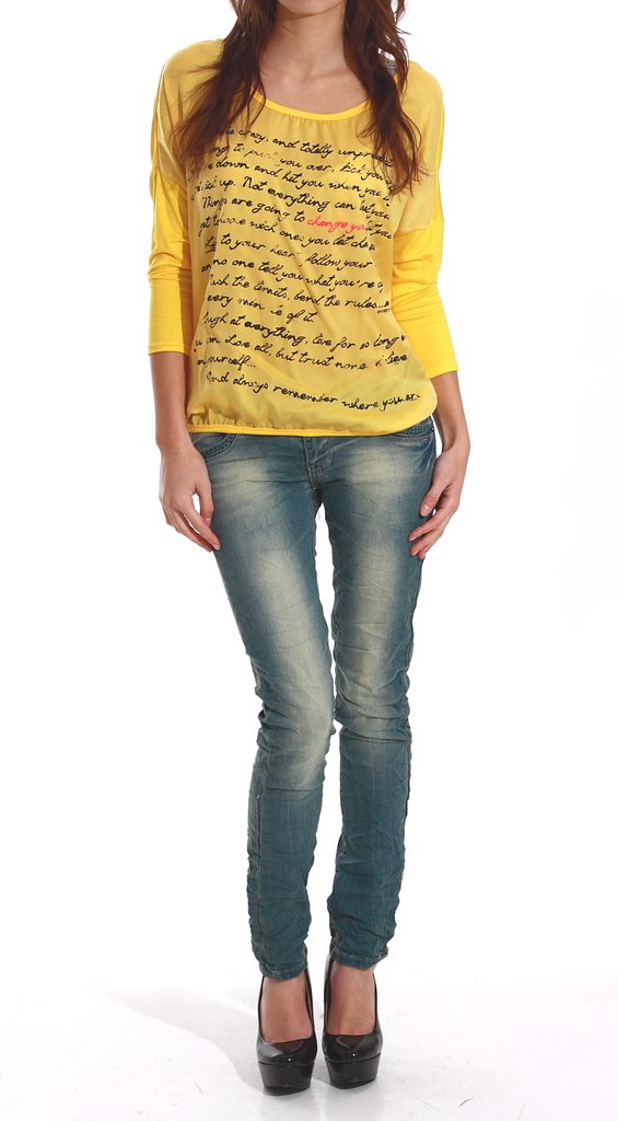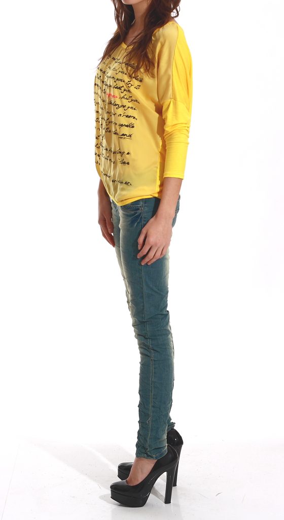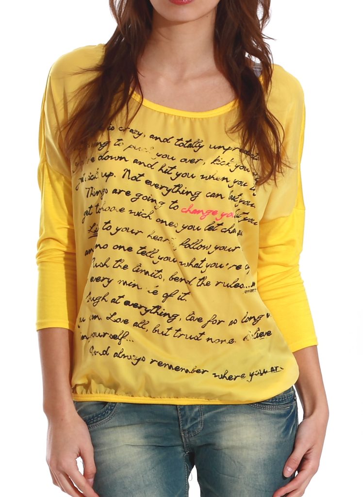Zářivý top v mladistvé barvě a materiálu. Přední část je s potiskem a velice příjemným materiálem. Top má 3/4 rukávy. Ve spodním lemu je gumička pro docílení balónovytého tvaru.