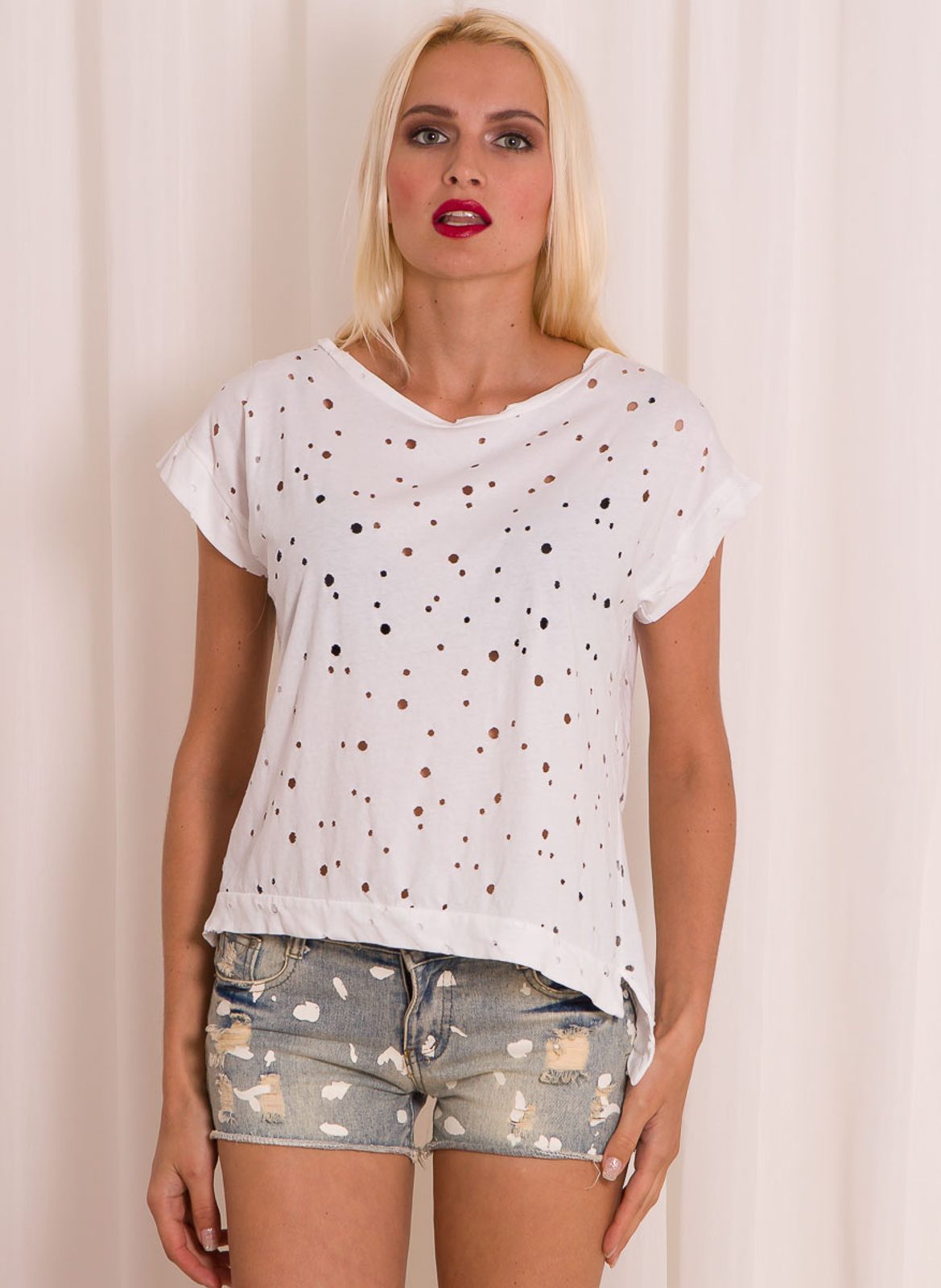 Dámské děrované tričko v bílé barvě. Tričko má krátké rukávy, kulatý výstřih. Zadní část je delší než přední. Skvěle se hodí ke kraťasům či úzkým kalhotám. Můžete ho vzít do města i pro volný čas.