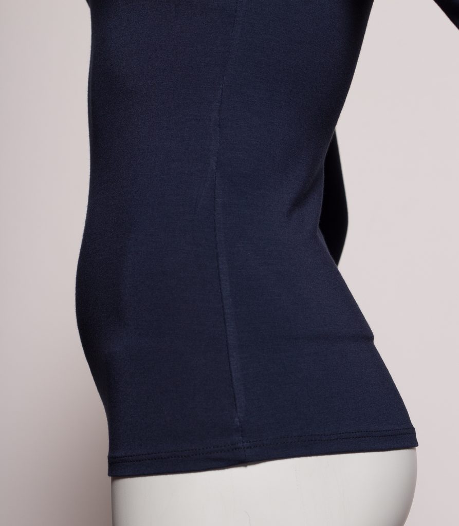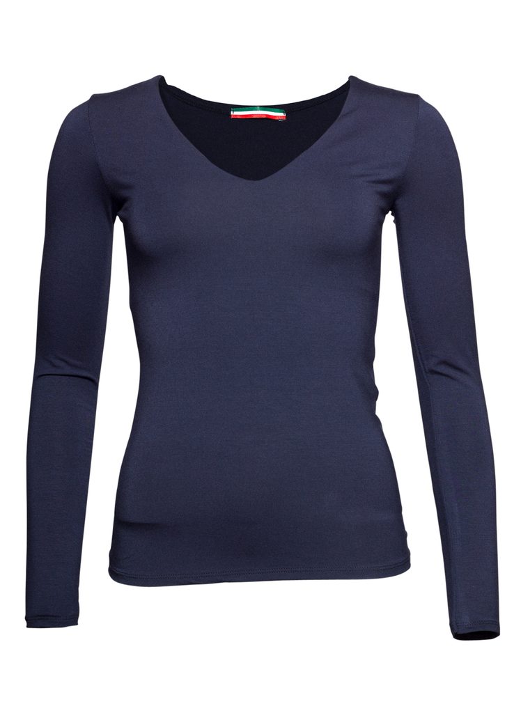 Dámský jednoduchý top v modré barvě. Top má dlouhé rukávy, výstřih do ,,V" a uplý střih. Skvěle sedí na těle. V horní části, přes prsa jsou dvě vrstvy látky. Vhodné ke kalhotám, jeanám či legínám. Můžete si ho vzít, jak do práce, do města i pro volný čas.