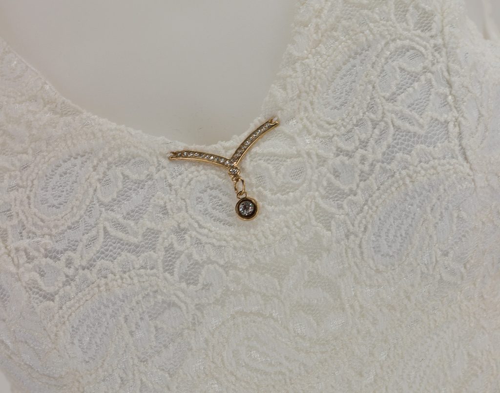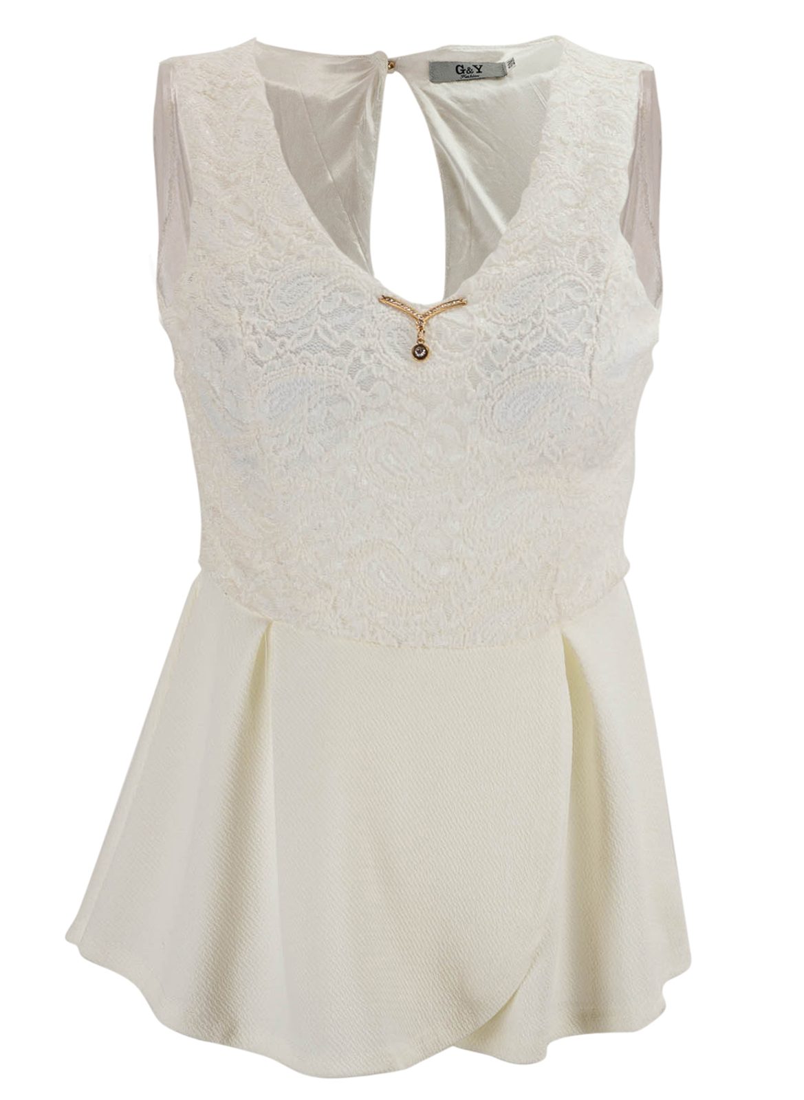 Dámské elegantní krajkové tílko v bílé barvě. Tílko má kulatý výstřih, na ozdobu je ve výstřihu zlatá spona. Dolní část je peplum - volán. Vhodné k legínám či jeanám, do města i do práce.