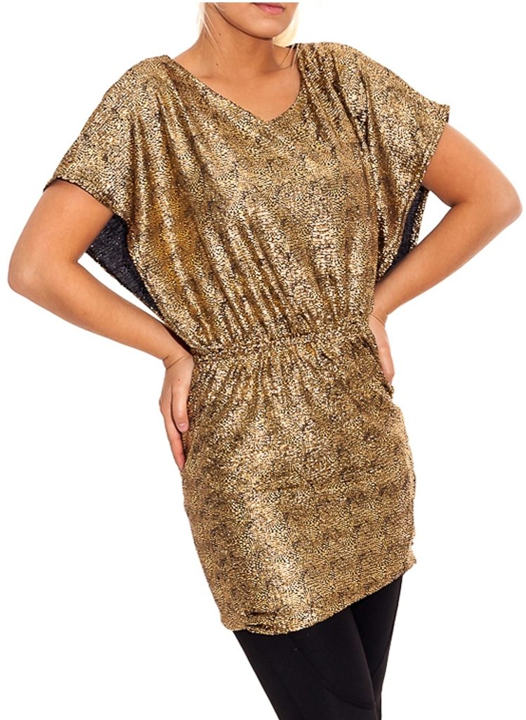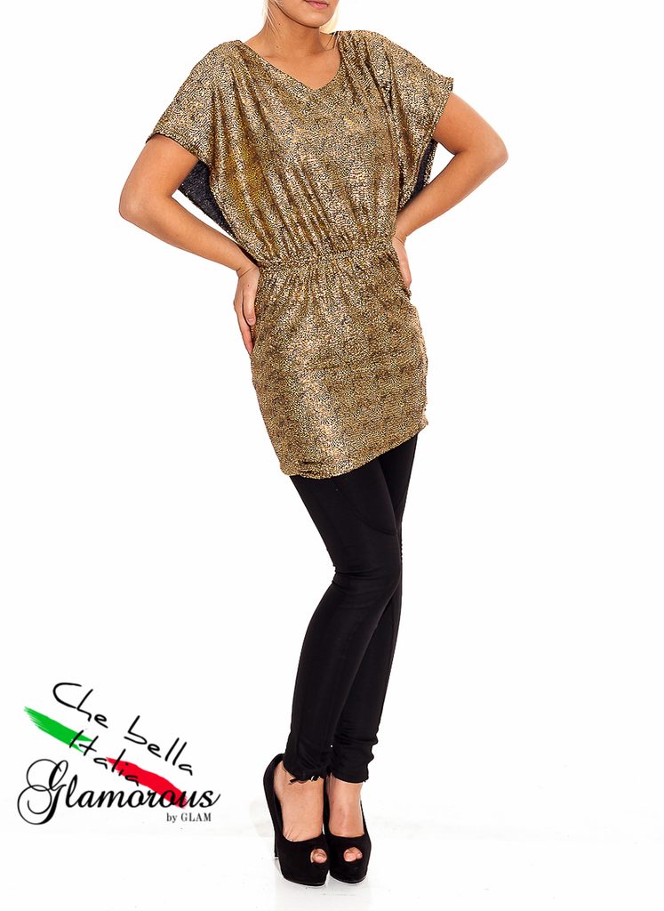 Dámský exkluzivní top s netopýřím střihem. Top má nádech kovové barvy. Jde o velice moderní střih, který se hodí k mnoha příležitostem. V pase je top stažený, jinak jde o velice vzdušný a volný střih. Jemný vzor přidává na elegantnosti.