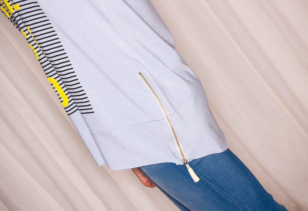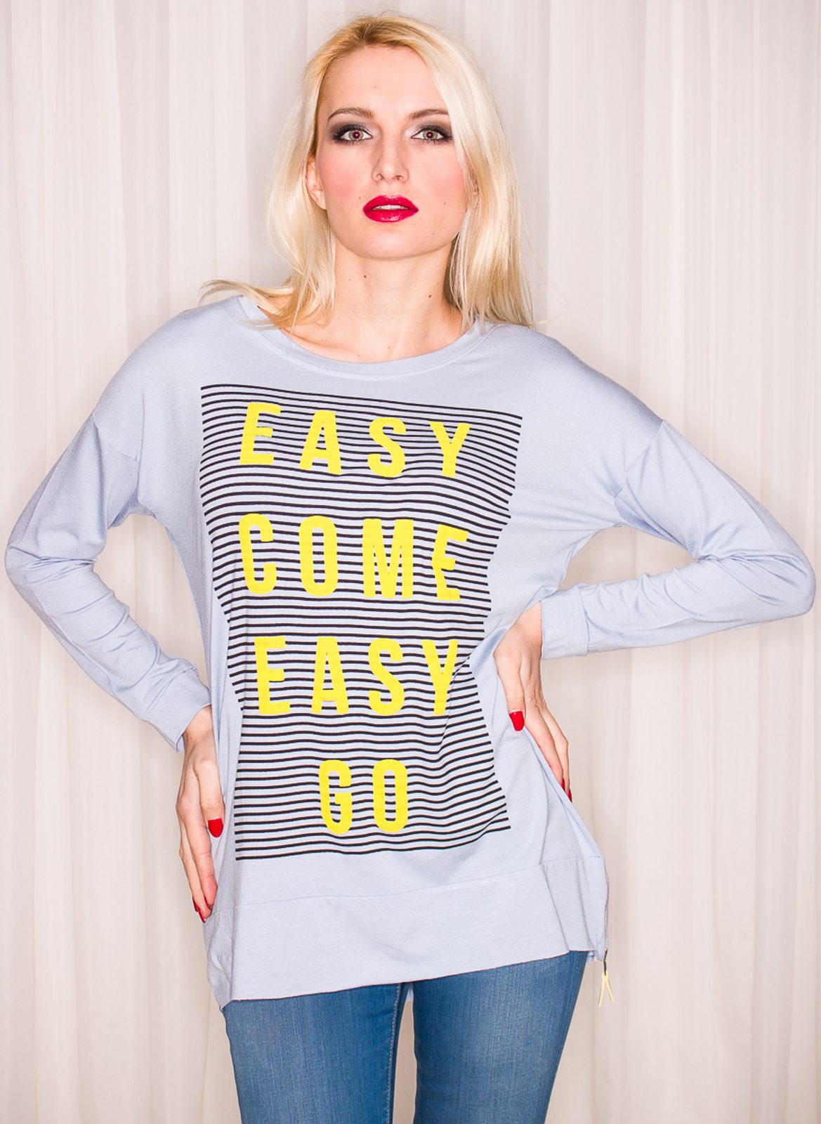 Dámský top s nápisem ve světle modré barvě. Top má dlouhé rukávy, kulatý výstřih. Motivem je žlutý nápis, který zaujme na první pohled. Top má na jednom boku zajímavý detail zip. Velmi příjemný materiál. Vhodné k legínám, jeanám či úzkým kalhotám. Můžete ho vzít do města, na párty i pro volný čas.