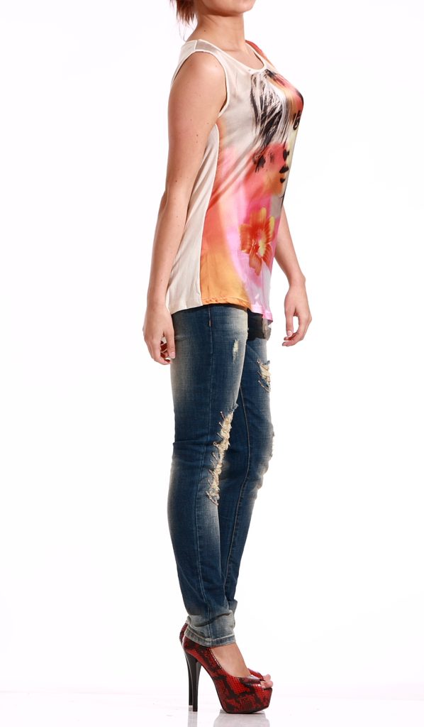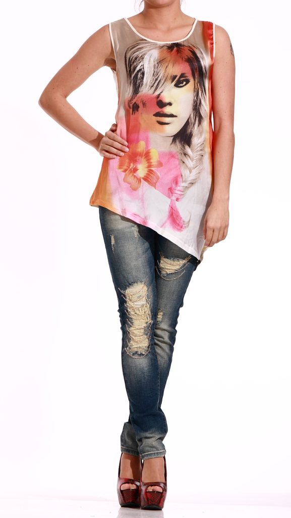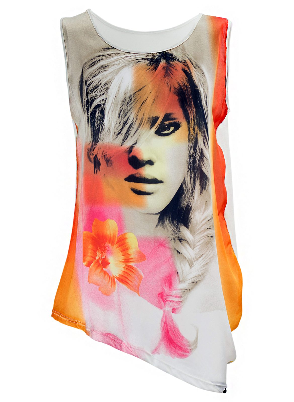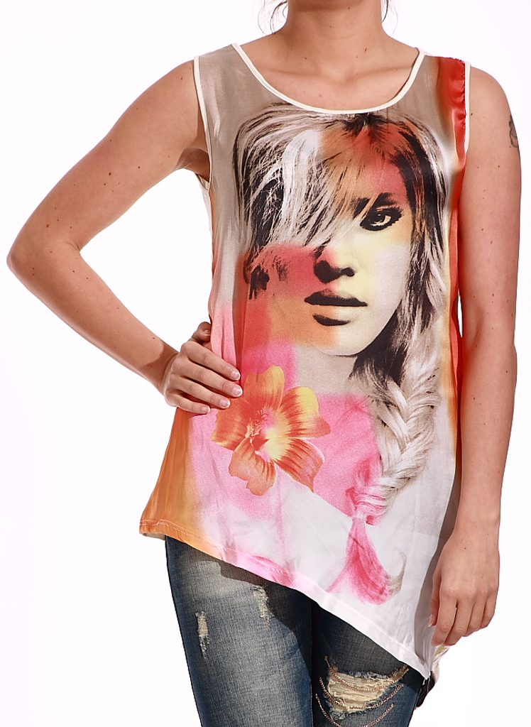 Dámský letní tunika v oranžové barvě. Tunika je bez rukávů, kulatý výstřih a asymetrický střih. Příjemný materiál. Tunika má na přední straně motiv obličeje ženy. Vhodné k legínám či jeanám pro volný čas i do města.