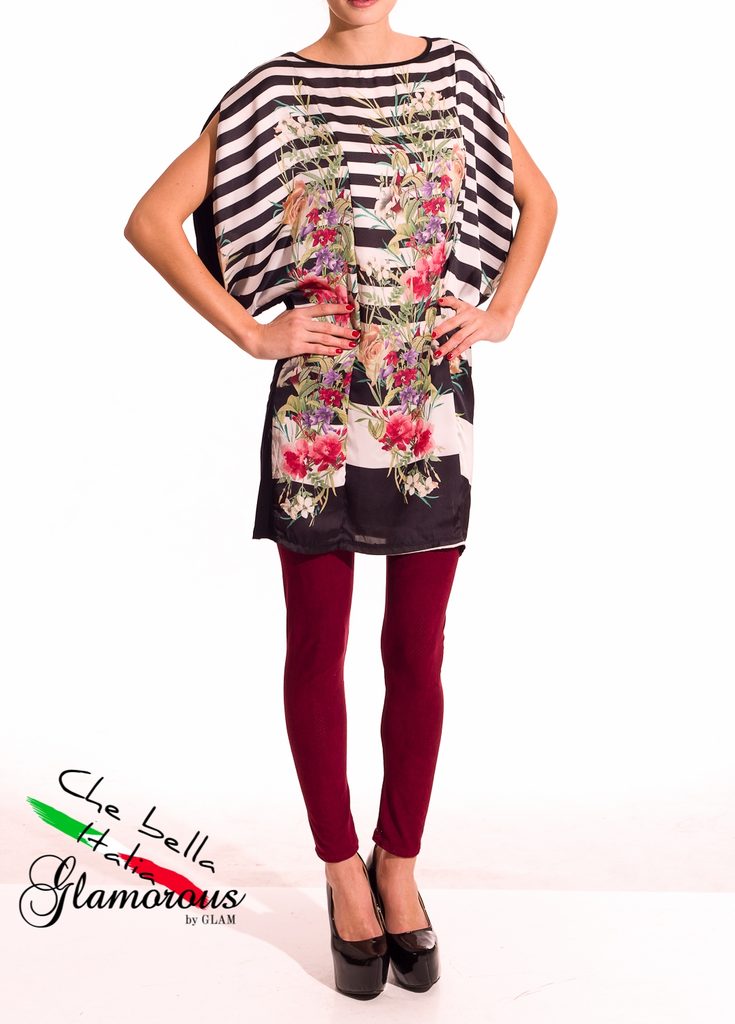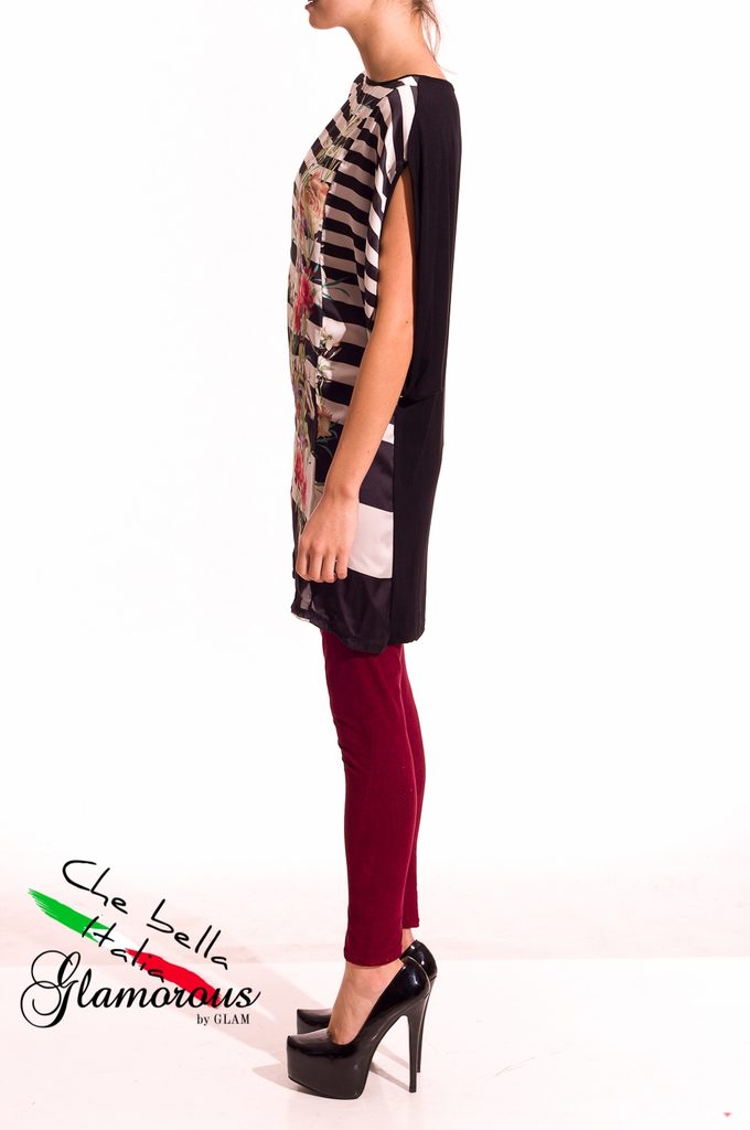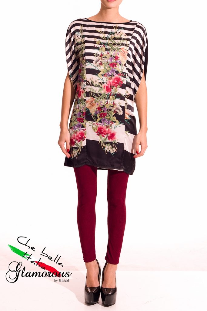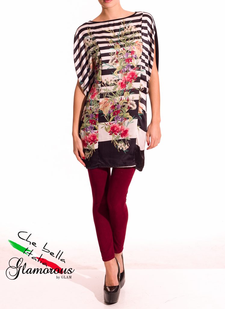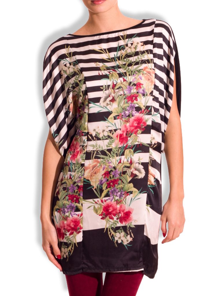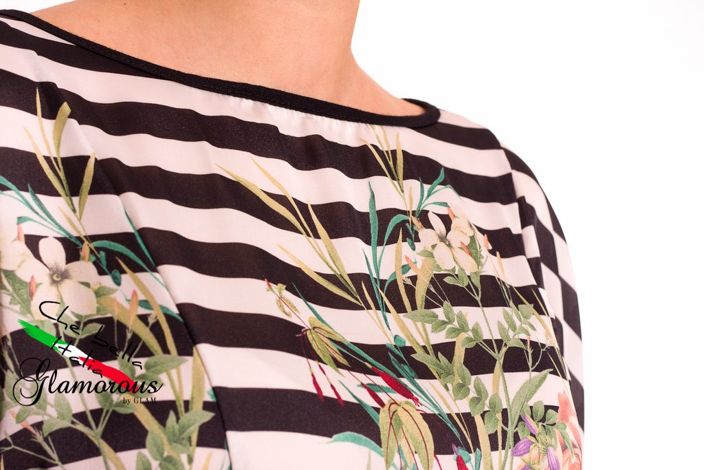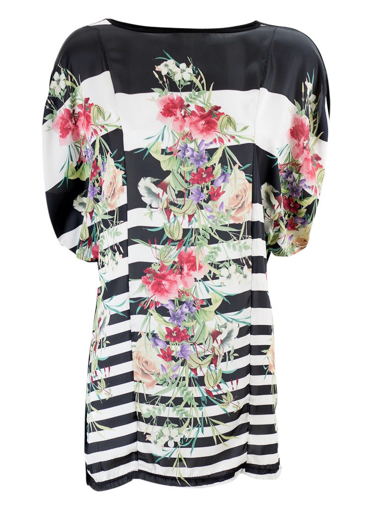 Dámská tunika s proužky a květy v černé barvě. Tunika má kulatý výstřih, krátké rukávy a je volnějšího střihu. Přední část je saténová s motivem bílo - černých proužků s barevnými květinami. Zadní část je celá černá. Vhodné k legínám či úzkým jeanám, do práce i do města.