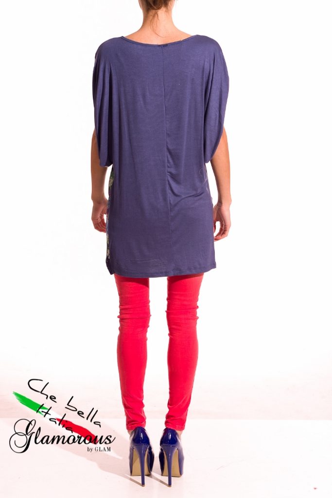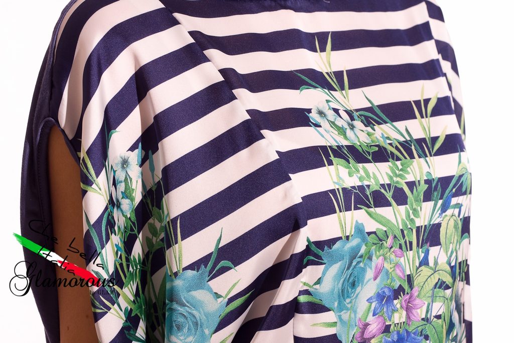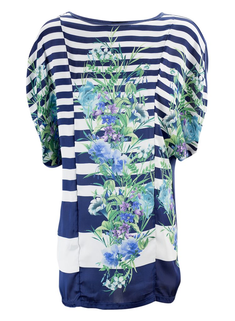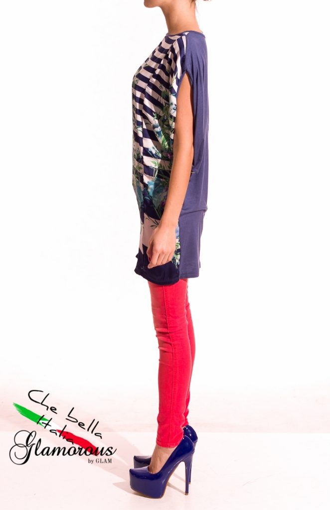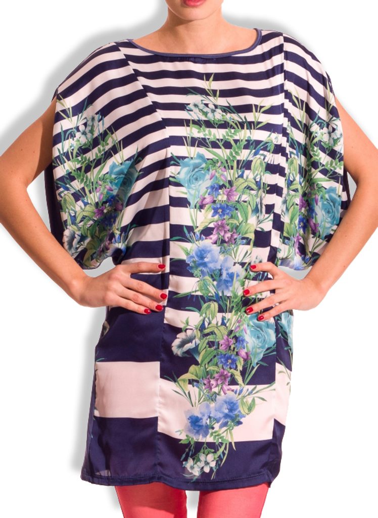 Dámská tunika s proužky a květy v modré barvě. Tunika má kulatý výstřih, krátké rukávy a je volnějšího střihu. Přední část je saténová s motivem bílo - modrých proužků s barevnými květinami. Zadní část je celá modrá. Vhodné k legínám či úzkým jeanám, do práce i do města.